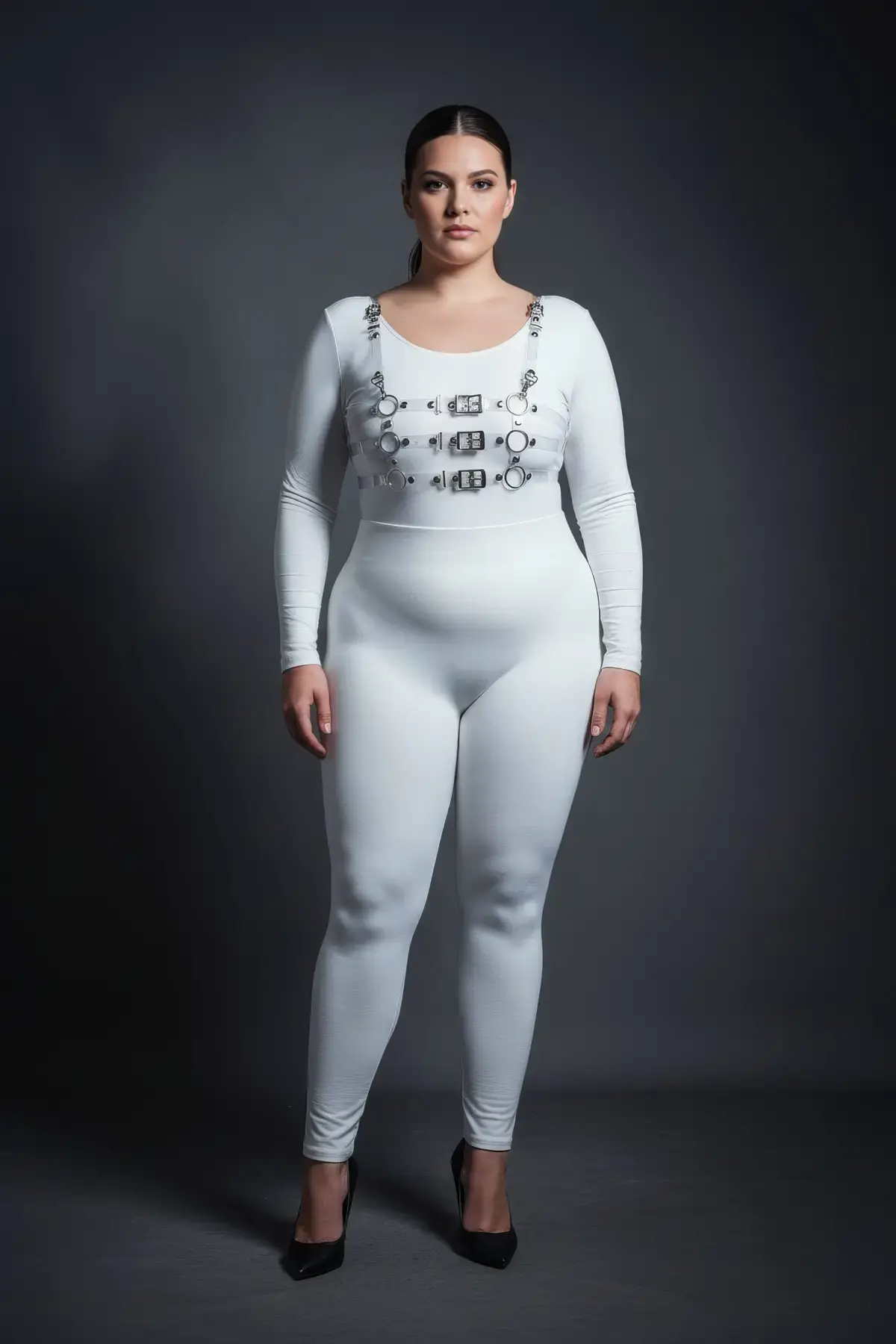 Büyük Beden Beyaz Kadın Harness Takım Deri Görünümlü Toka Detaylı - APFT1058