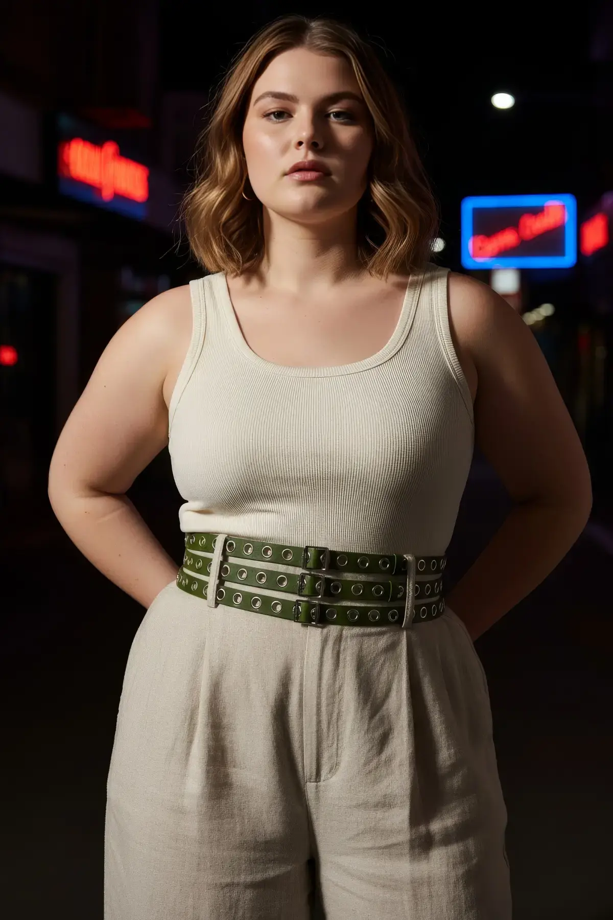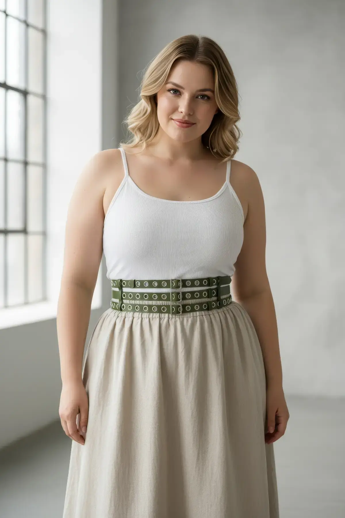 Büyük Beden Haki Kadın Kalın Kemer Çift Sıra Kuş Gözü Detaylı - APFT641