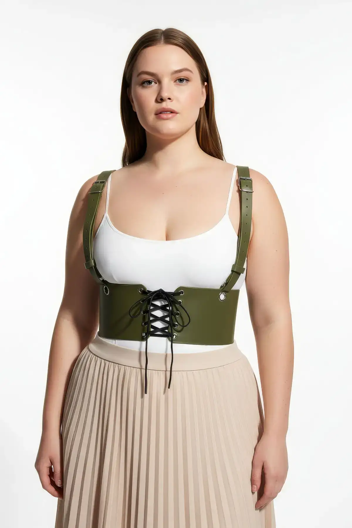 Büyük Beden Haki Kadın Kemer Omuz Askılı Bağlamalı Korse Stili - APFT1429