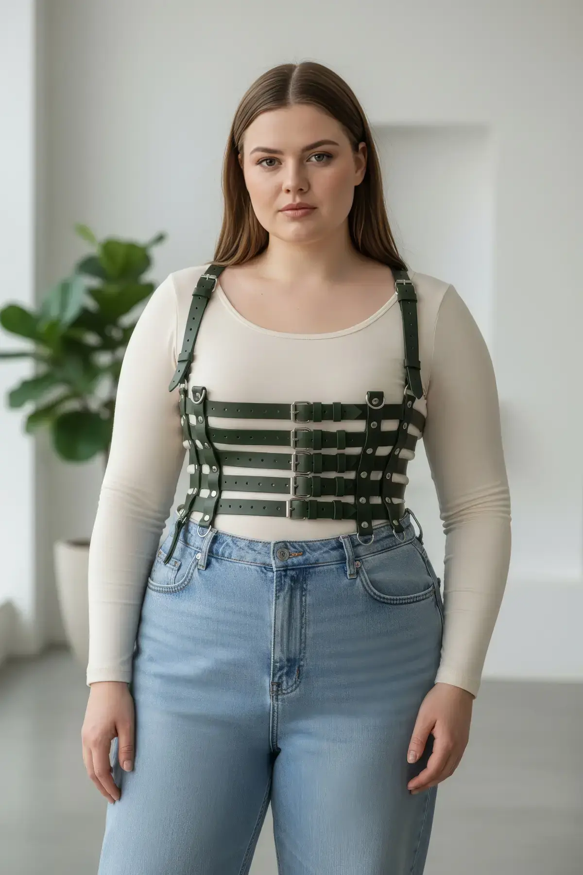 Büyük Beden Haki Kadın Kemer Omuz Askılı Deri Korse Stil Geniş Aksesuar - APFT630