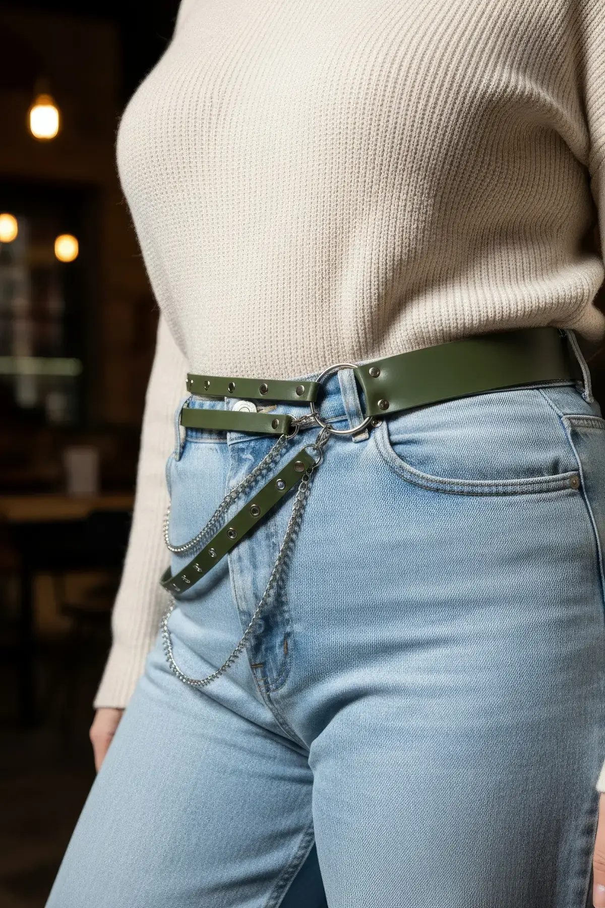 Büyük Beden Haki Kadın Kemer Zincir Detaylı Çoklu Kayışlı Deri Görünüm - APFT586