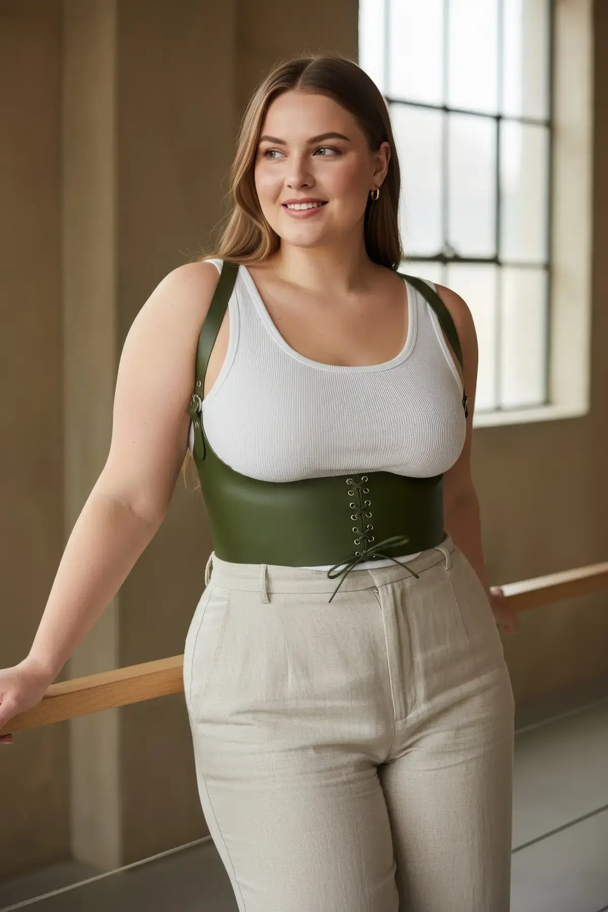 Büyük Beden Haki Kadın Korse Kemer Bağcıklı Detaylı Estetik Tasarım - APFT855