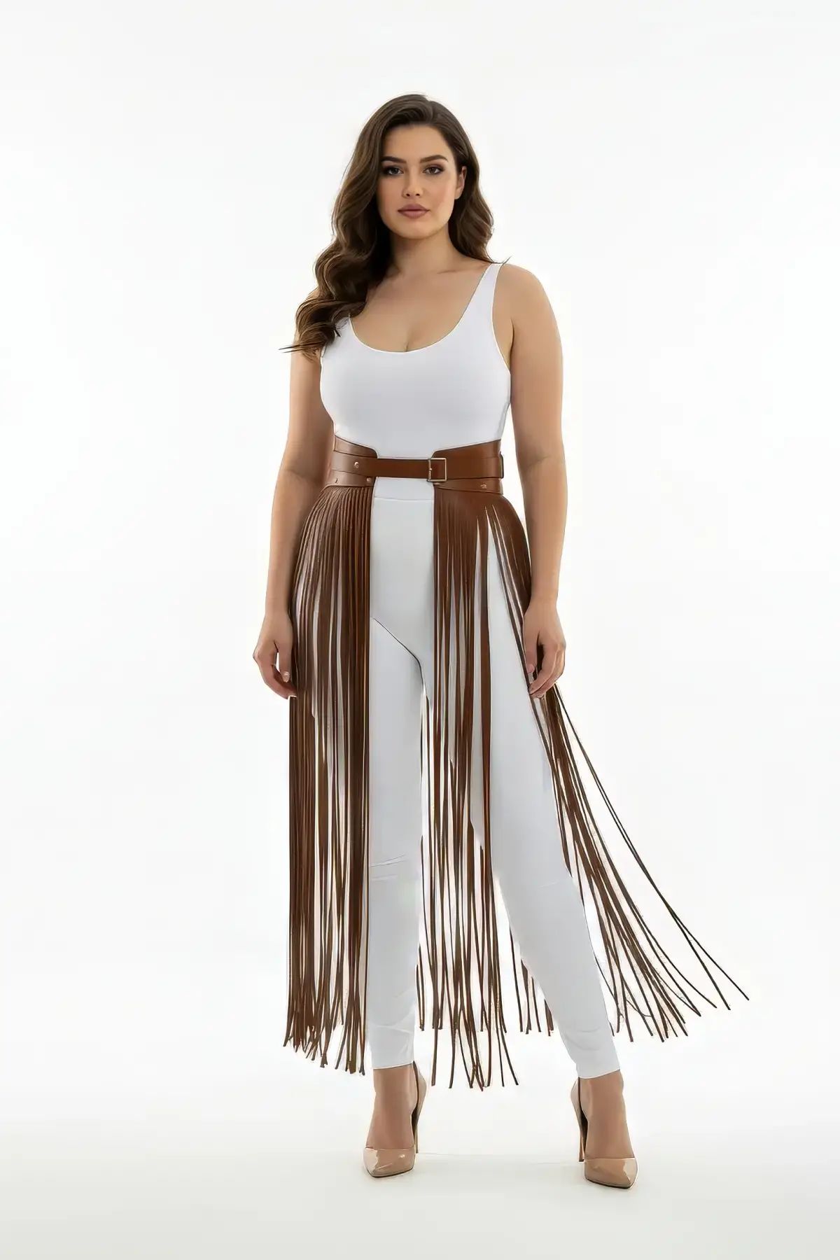 Büyük Beden Kahverengi Etek Uzun Püsküllü Deri Aksesuar - APFT1003