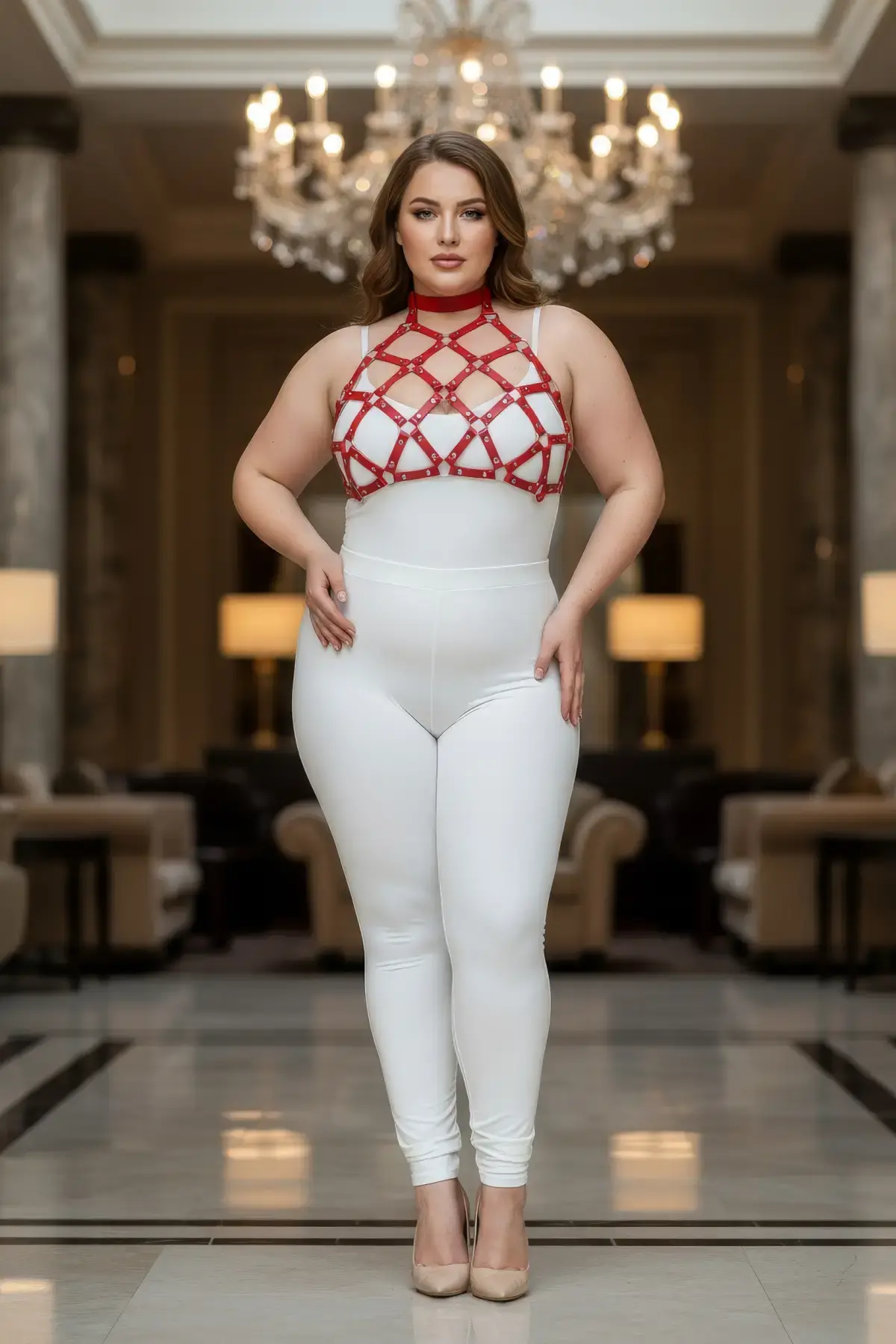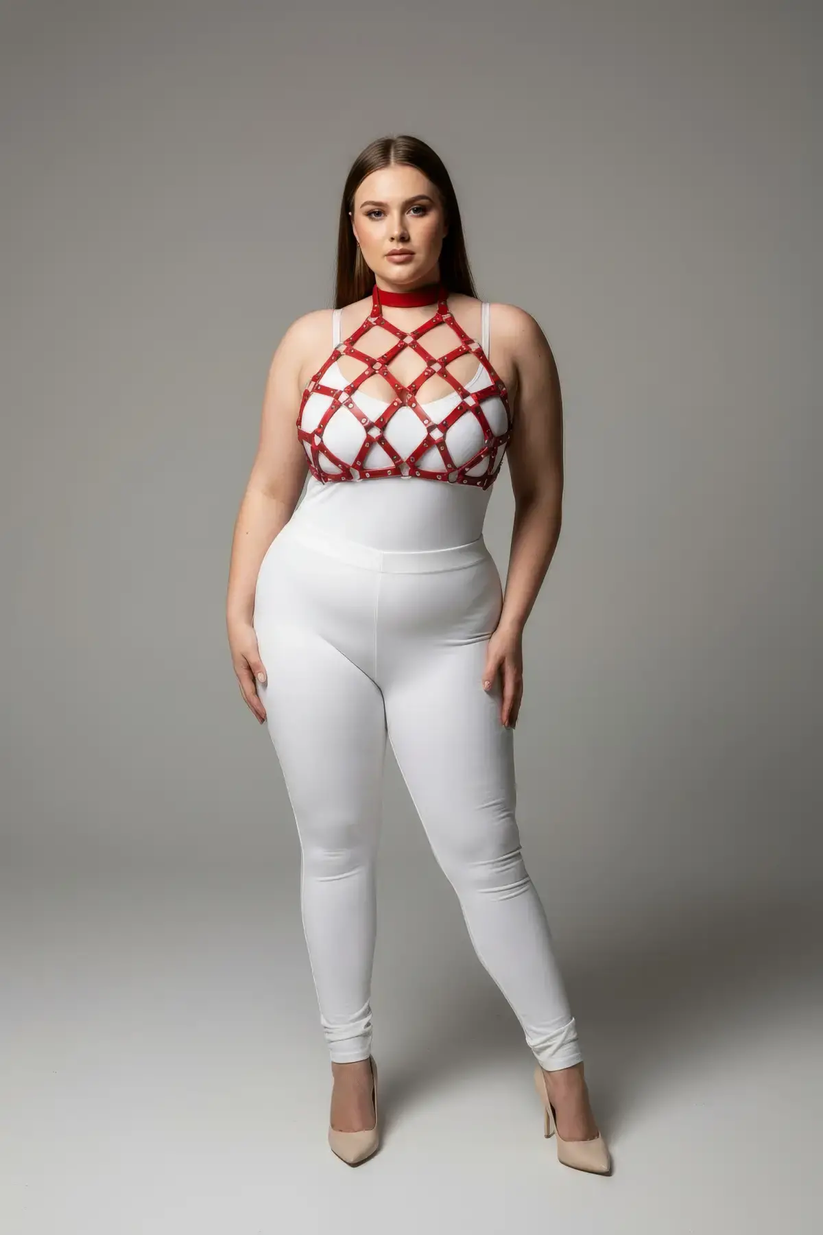 Büyük Beden Kırmızı Kadın Deri Harness Takım Çivi Detaylı Şık Aksesuar - APFT443