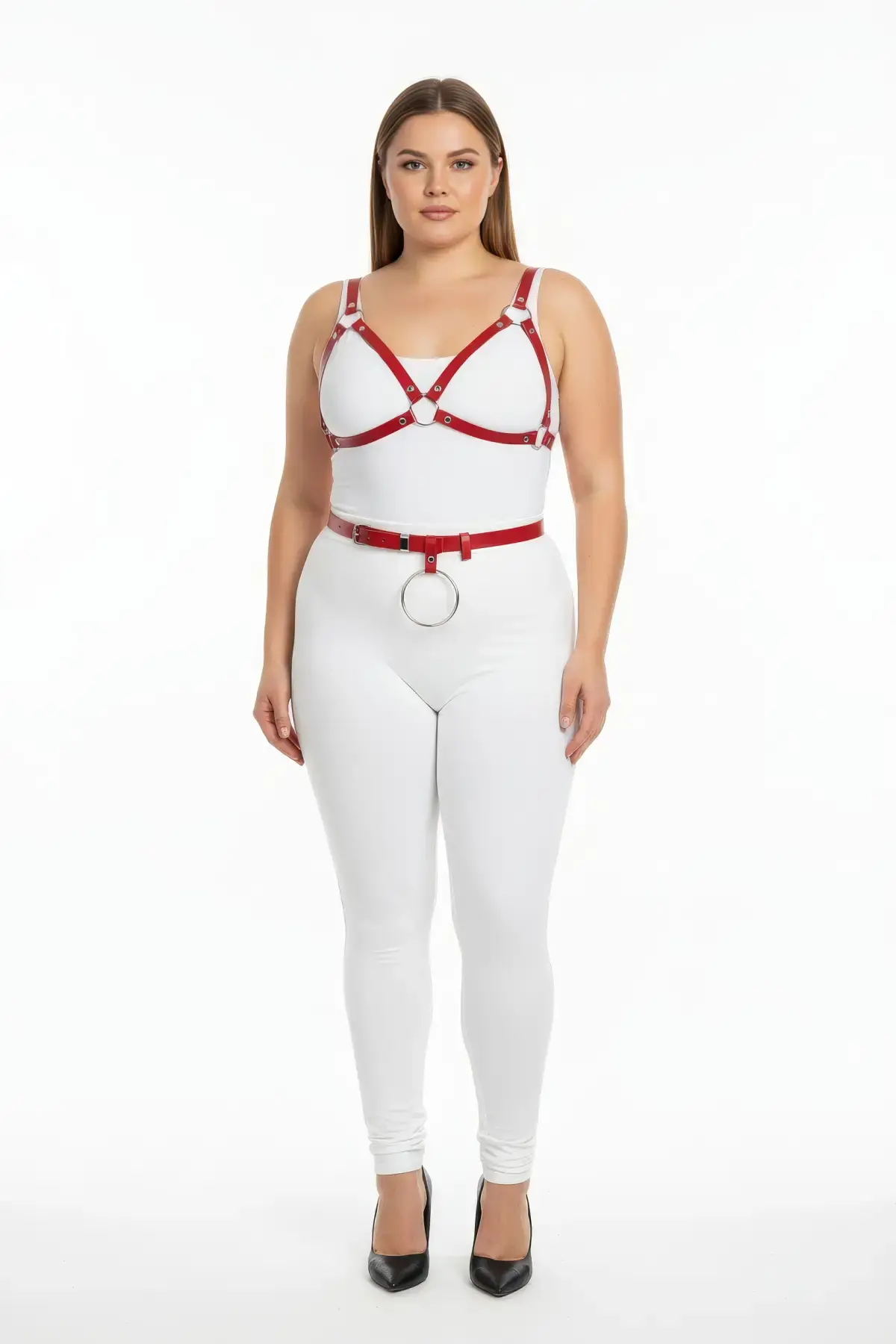 Büyük Beden Kırmızı Kadın Deri Harness Takım Şık Fantazi Vücut Aksesuarı - APFT245