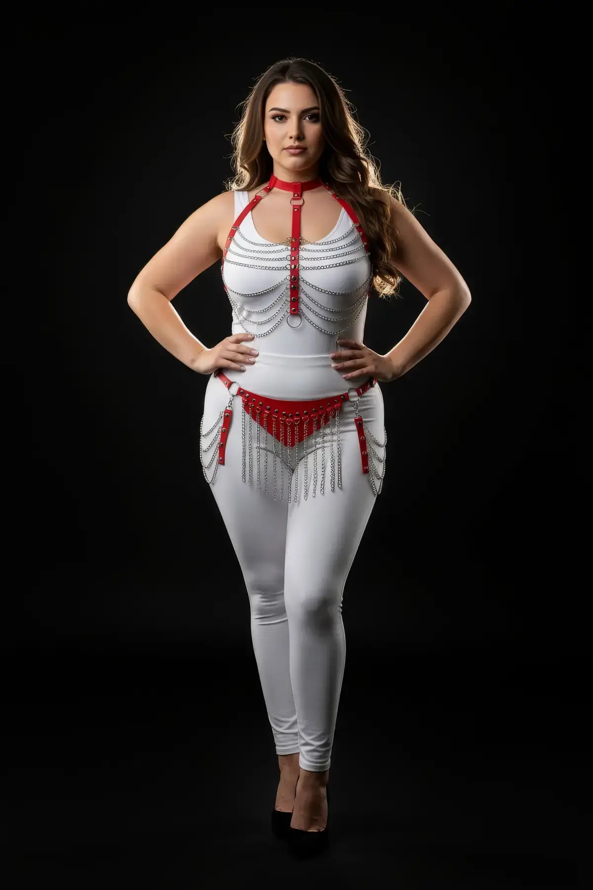 Büyük Beden Kırmızı Kadın Deri Harness Takım Zincir Detaylı Fantezi Aksesuar - APFT1350