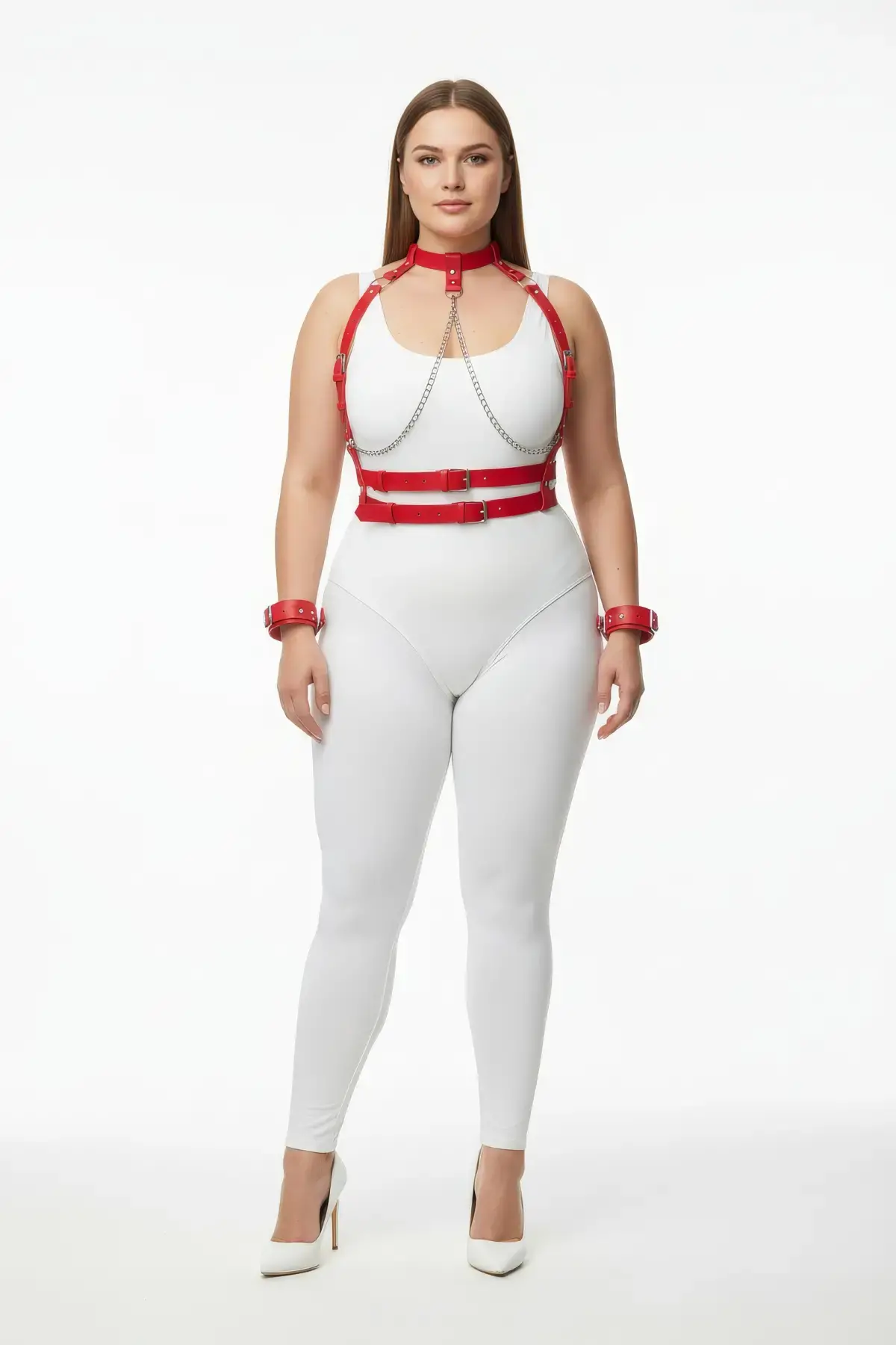 Büyük Beden Kırmızı Kadın Deri Harness Takım Zincir Detaylı Fantezi Aksesuar - APFT1350