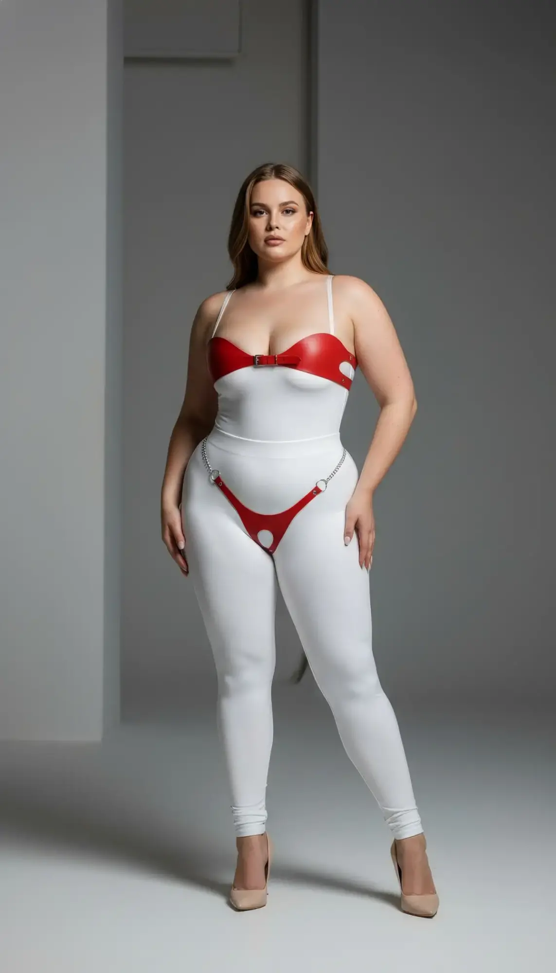 Büyük Beden Kırmızı Kadın Deri Zincir Detaylı Fantezi Harness Takım - APFT1234