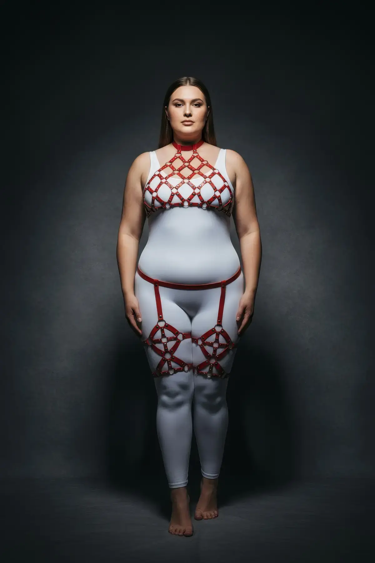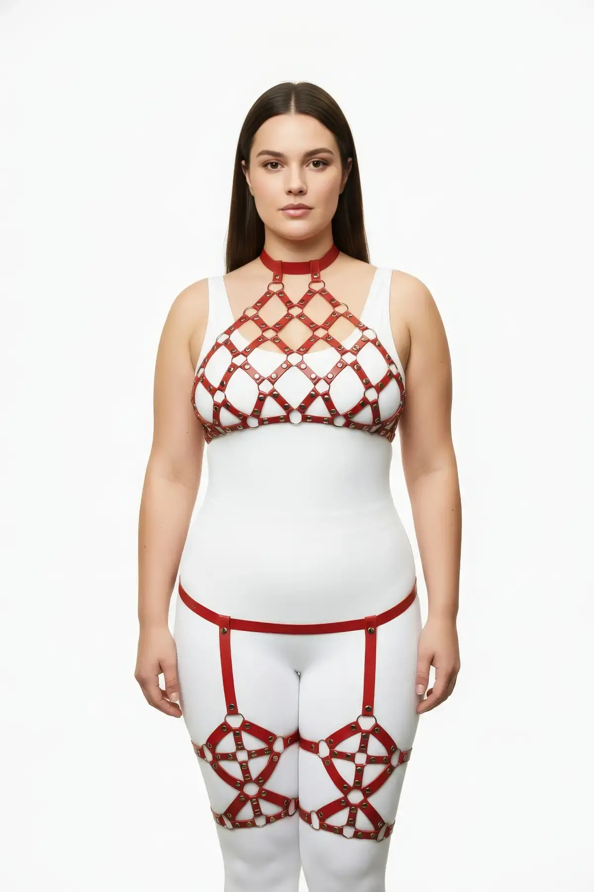 Büyük Beden Kırmızı Kadın Deri Harness Takım Zincir Detaylı Fantezi Aksesuar - APFT1350