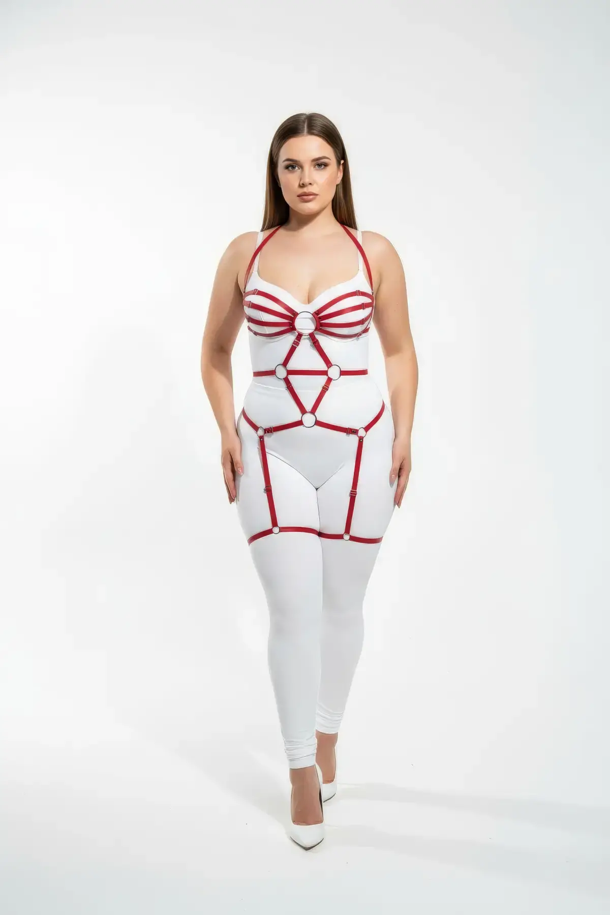 Büyük Beden Kırmızı Kadın Jartiyer Harness Tam Vücut Halka Detaylı Fantazi Aksesuar - APFT568