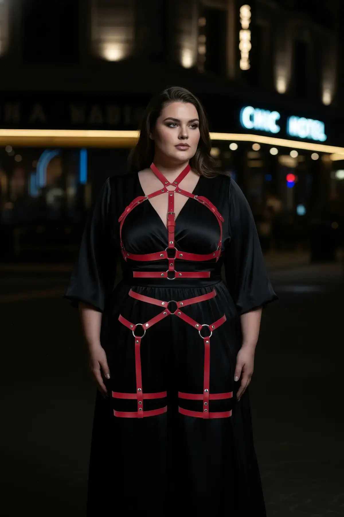 Büyük Beden Kırmızı Kadın Jartiyer Harness Tüm Vücut Saran Deri Fantazi Aksesuar - APFT598