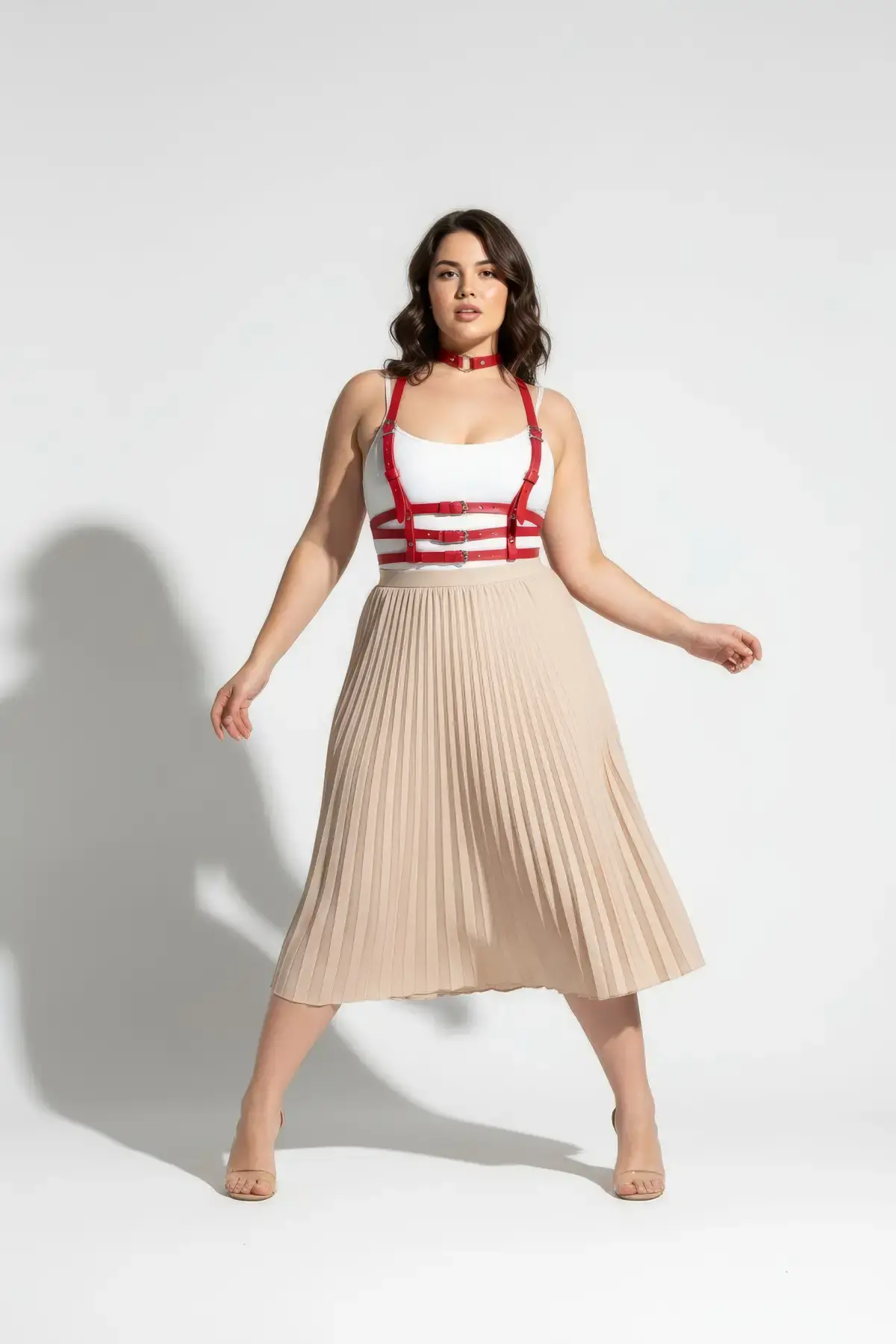 Büyük Beden Kırmızı Kadın Kemer Deri Harness Korse Görünümlü Vücut Aksesuarı - APFT615