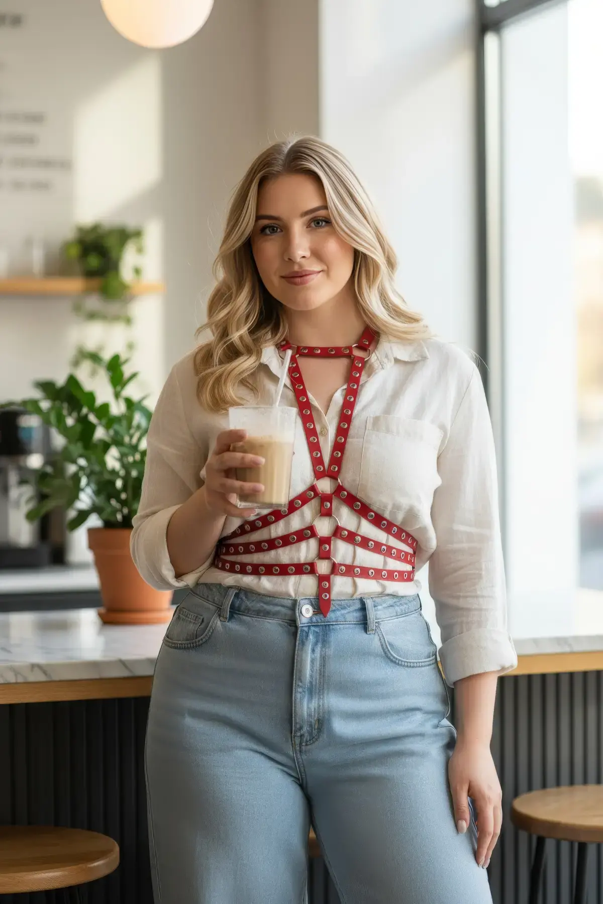 Büyük Beden Kırmızı Kadın Kemer Harness Tarzı Metal Detaylı Deri Vücut Aksesuarı - APFT546