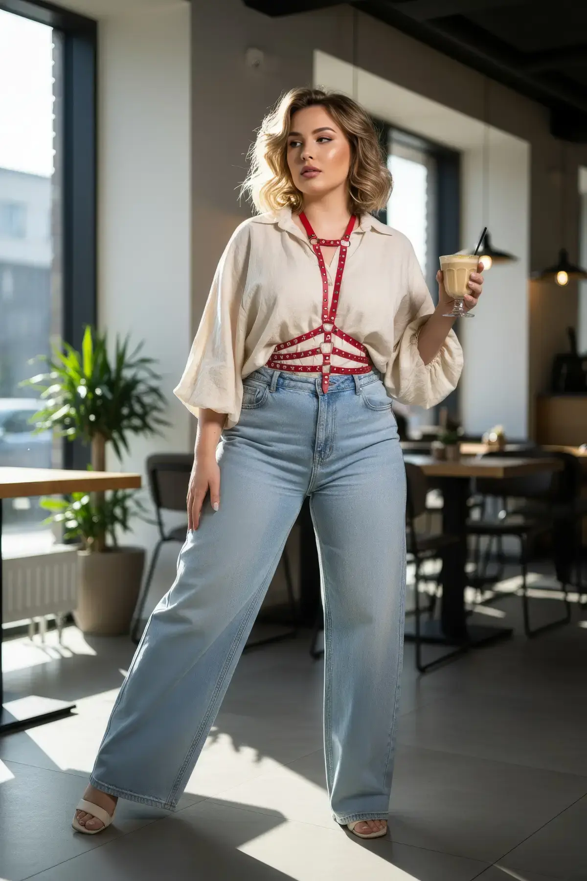 Büyük Beden Kırmızı Kadın Deri Harness Takım Zincir Detaylı Özel Tasarım - APFT796