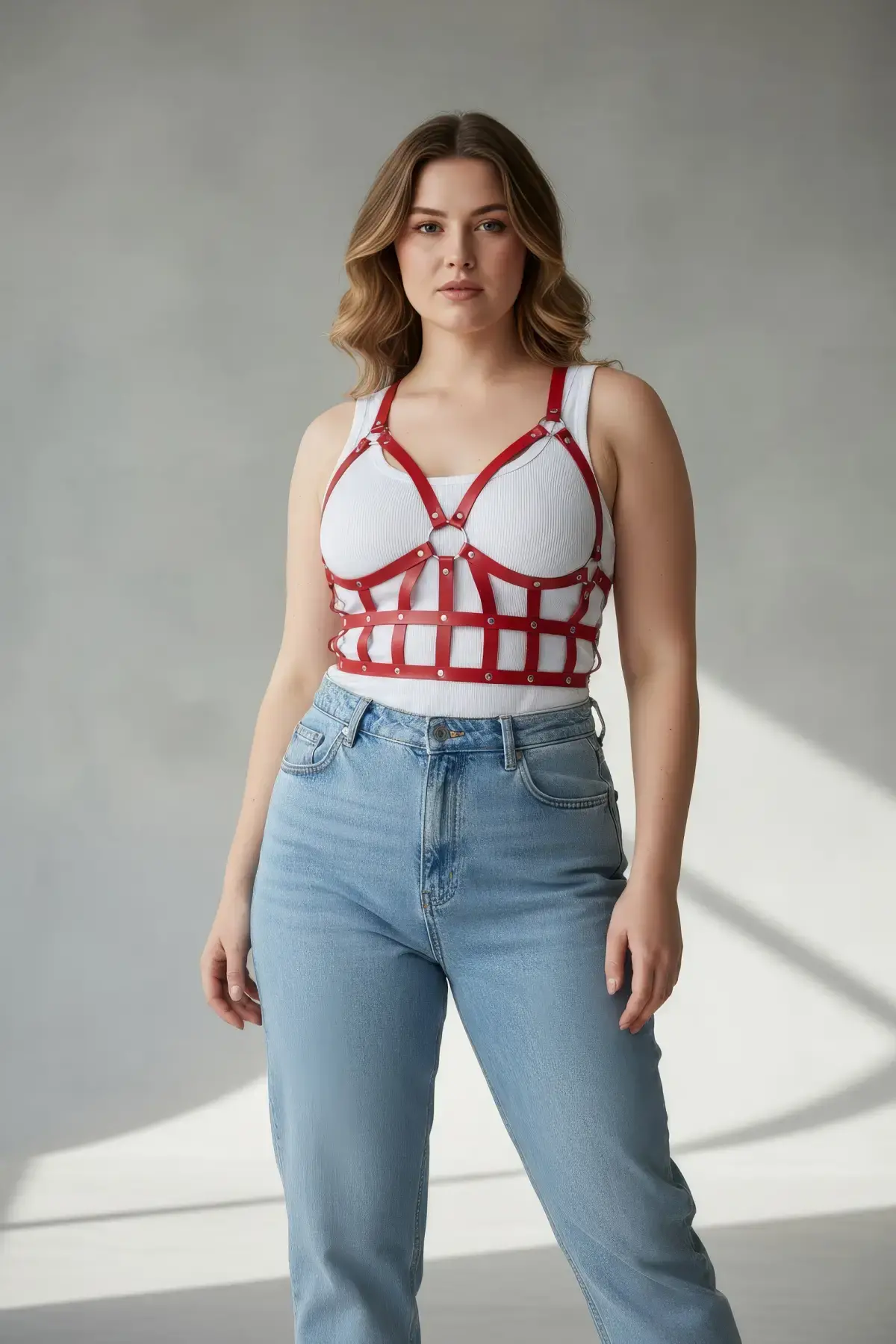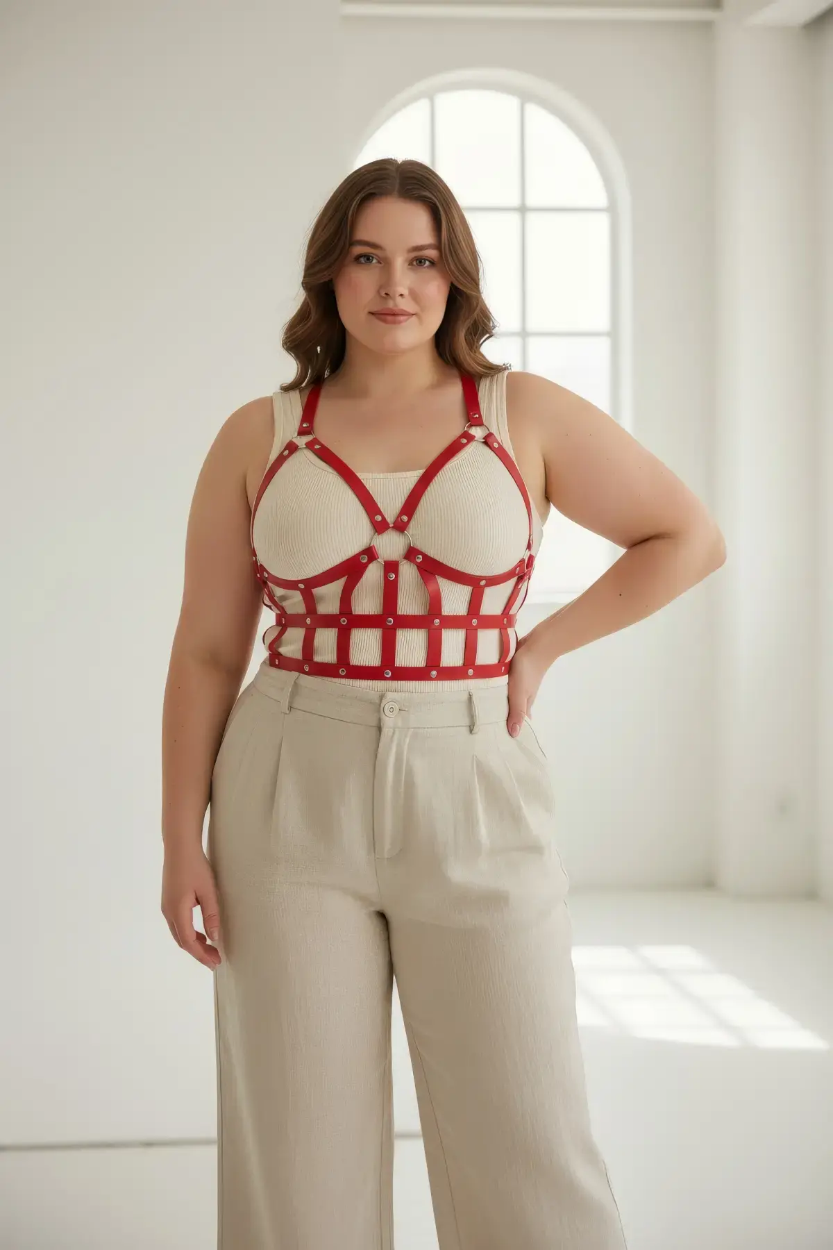 Büyük Beden Kırmızı Kadın Deri Harness Takım Çapraz Askılı Estetik Vücut Aksesuarı - APFT247
