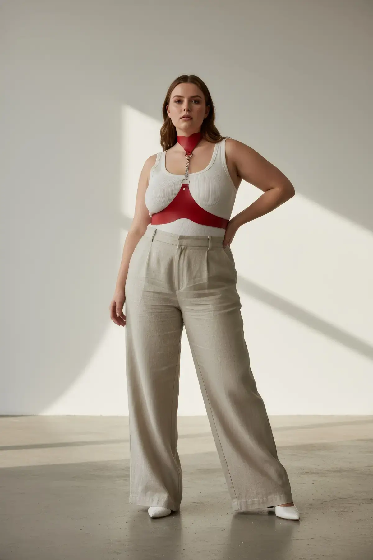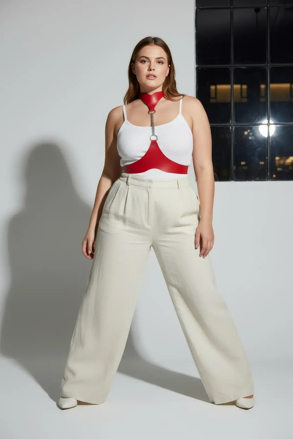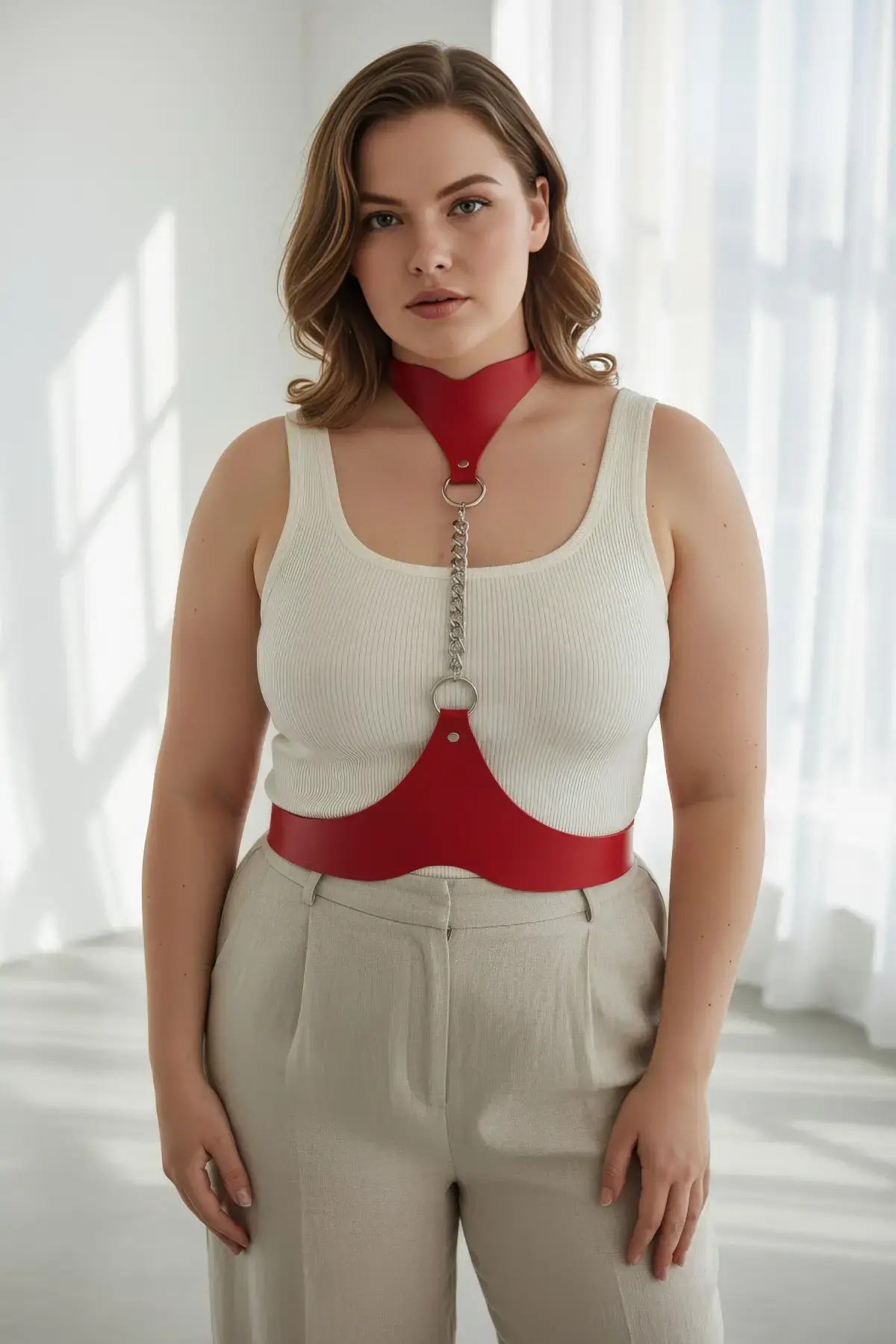 Büyük Beden Kırmızı Kadın Kemer Zincir Detaylı Deri Harness Vücut Aksesuarı - APFT824