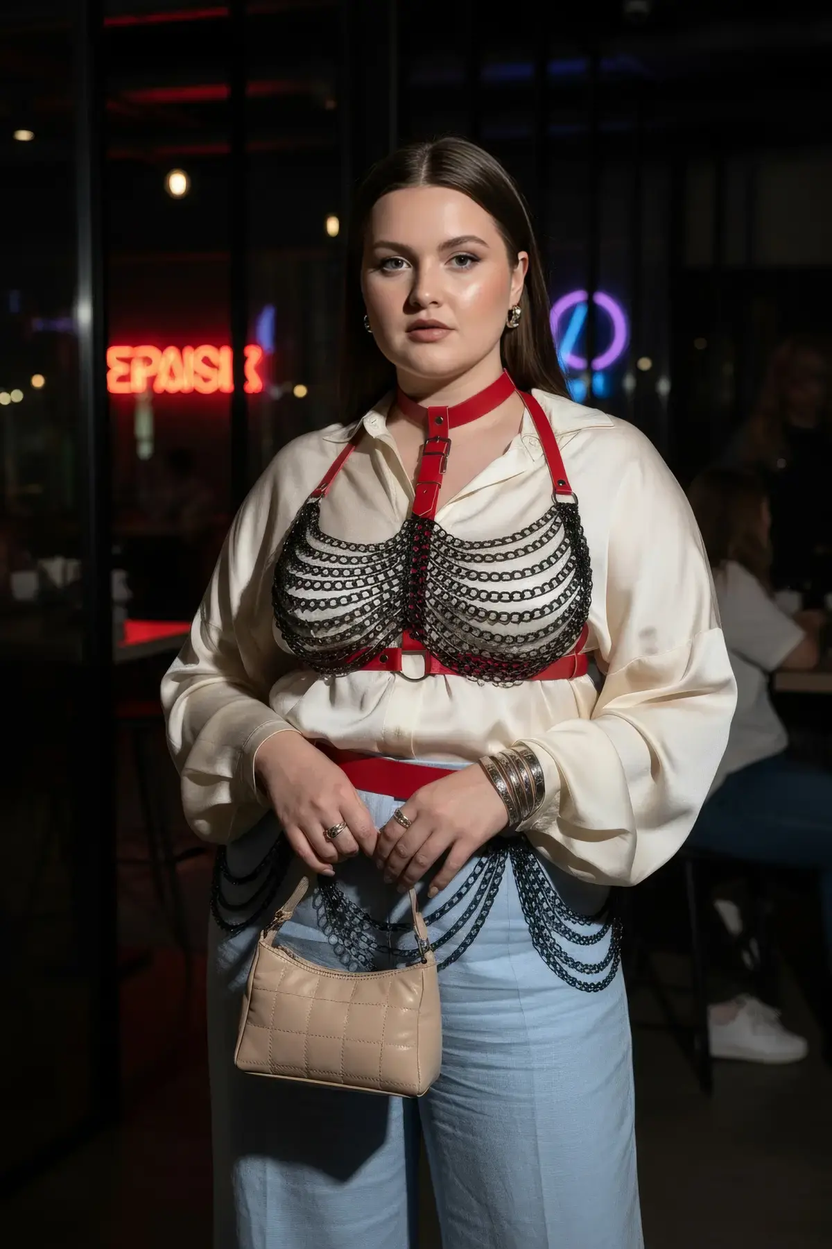 Büyük Beden Kırmızı Kadın Kemer Zincir Detaylı Deri Harness Vücut Aksesuarı - APFT824