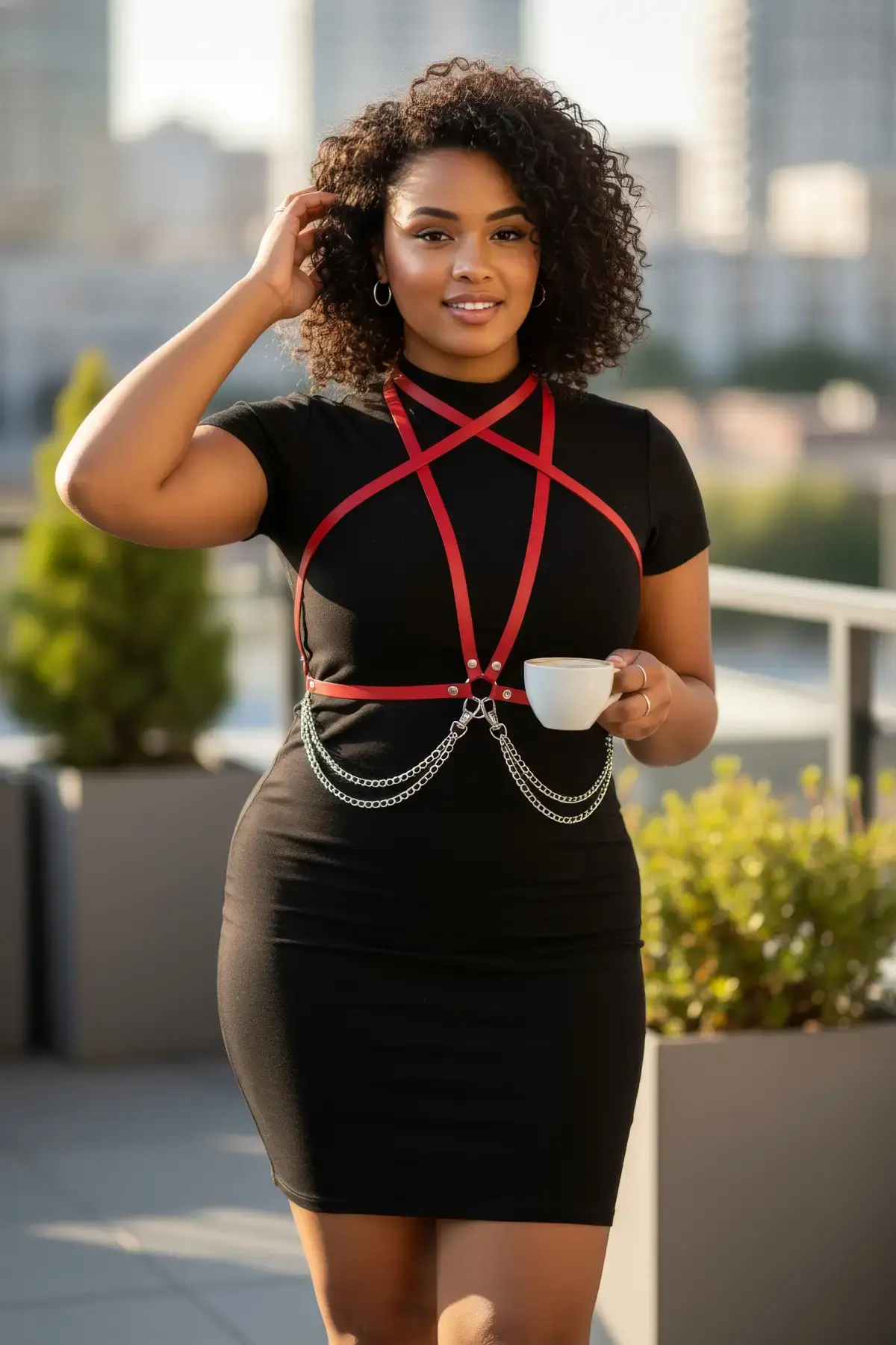 Büyük Beden Kırmızı Kadın Kemer Deri Harness Zincir Detaylı Vücut Aksesuarı - APFT9