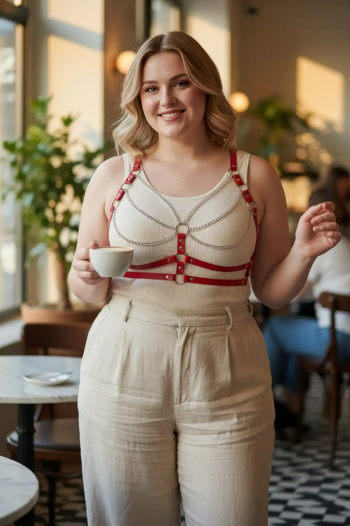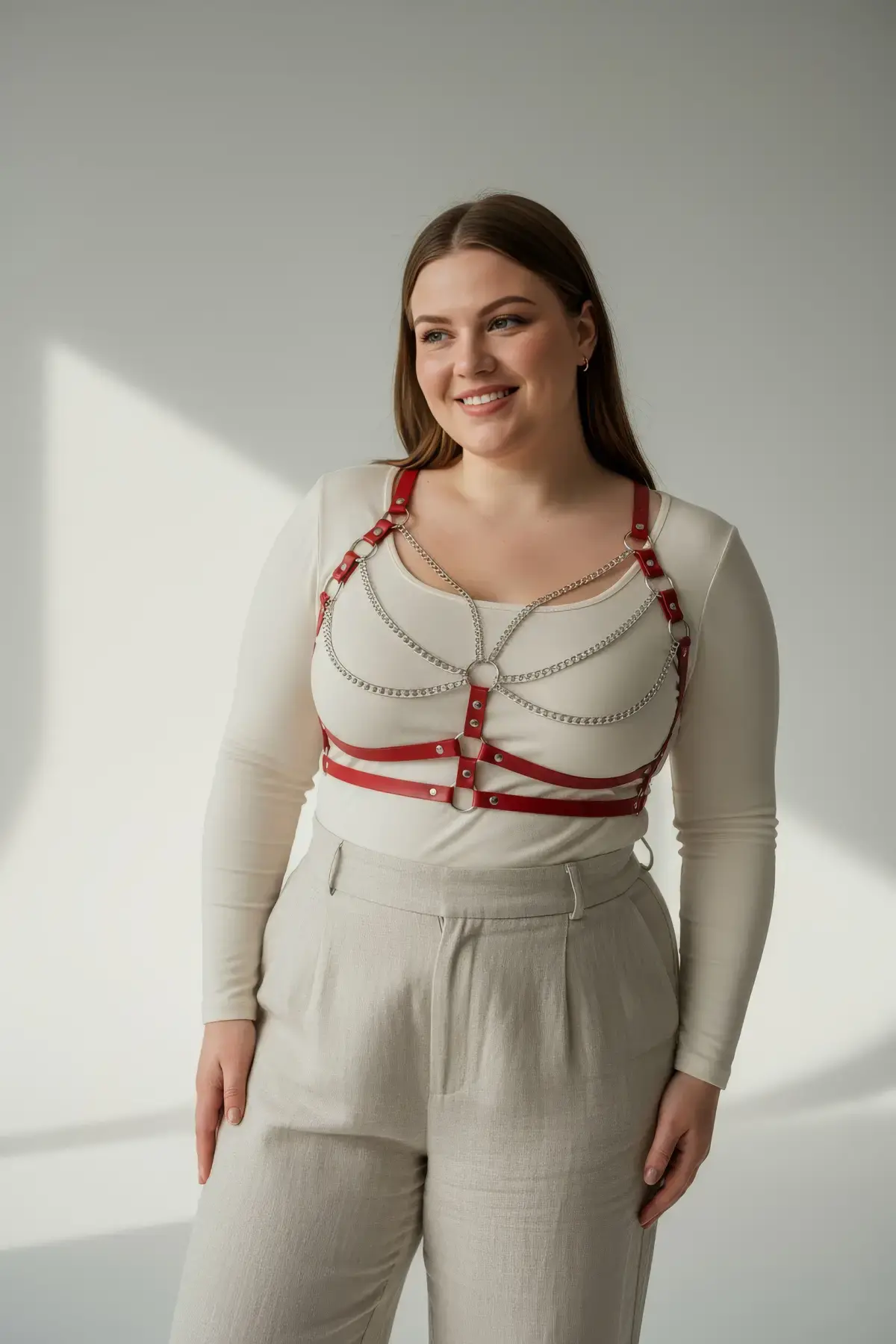 Büyük Beden Kırmızı Kadın Kemer Deri Harness Zincir Detaylı Vücut Aksesuarı - APFT9