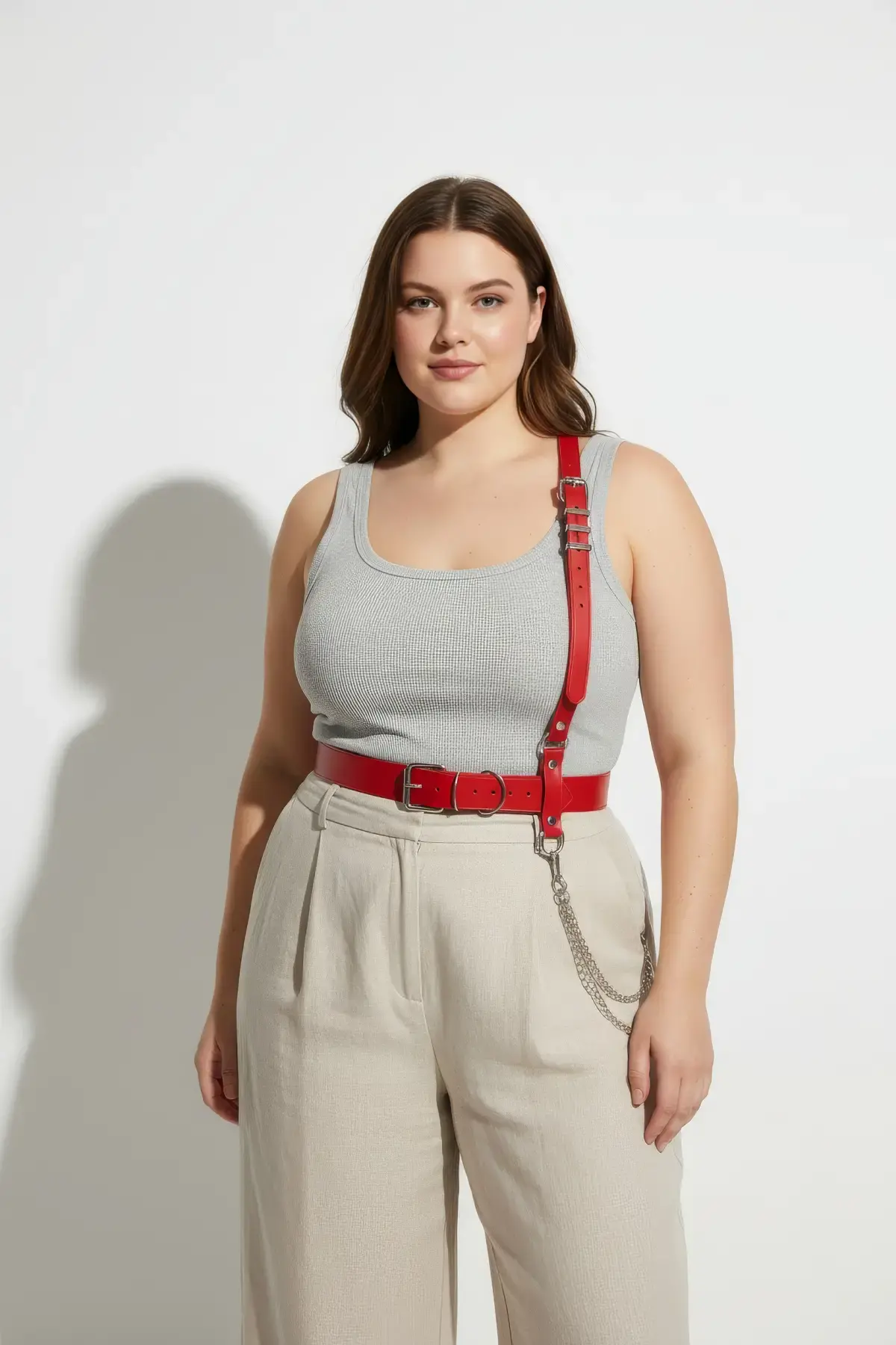 Büyük Beden Kırmızı Kadın Kemer Zincir Detaylı Deri Vücut Aksesuarı - APFT52