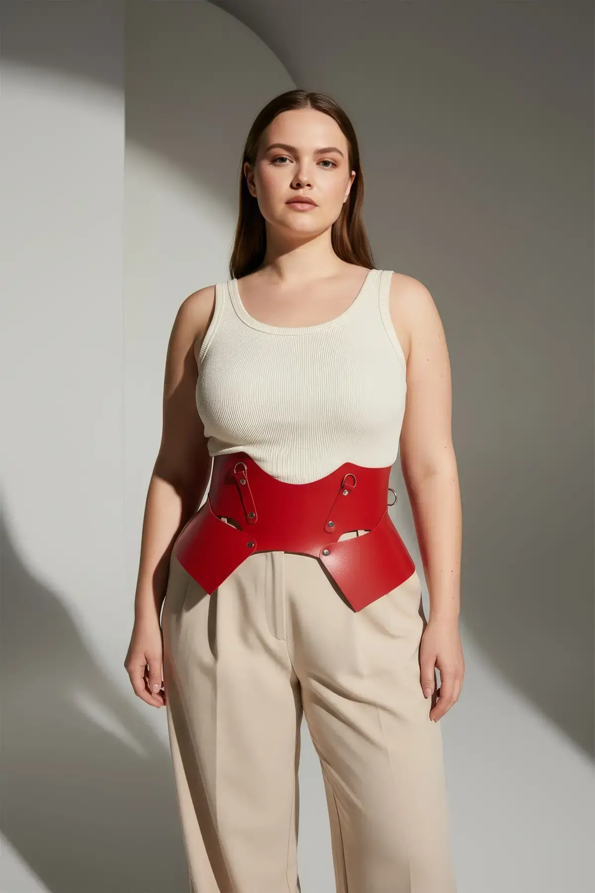 Büyük Beden Kırmızı Kadın Kemer Korse Stili Askılı Deri Vücut Aksesuarı - APFT787