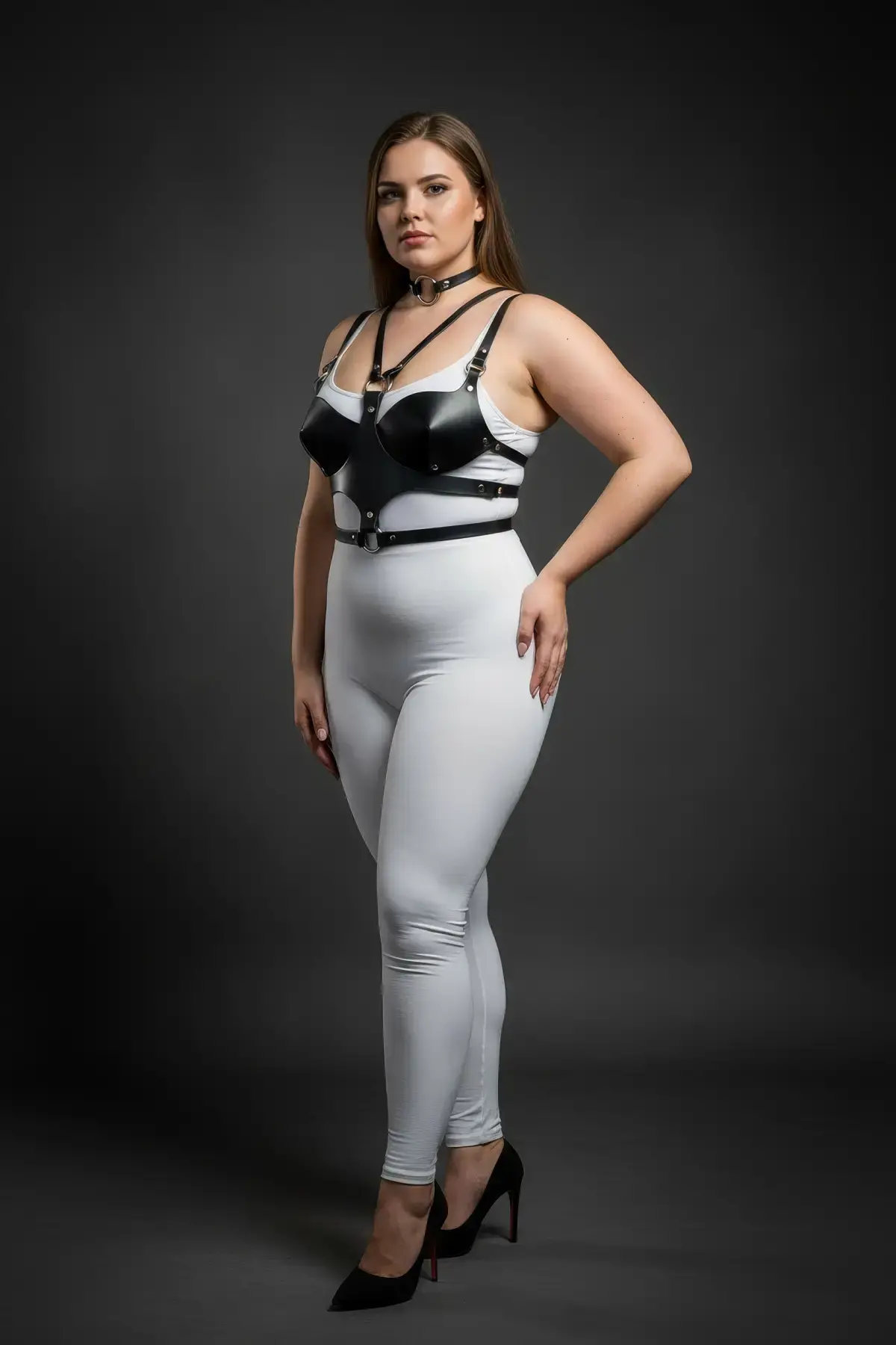 Büyük Beden Siyah Kadın Full Body Deri Harness Takım Jartiyer Detaylı Özel Tasarım - APFT1231