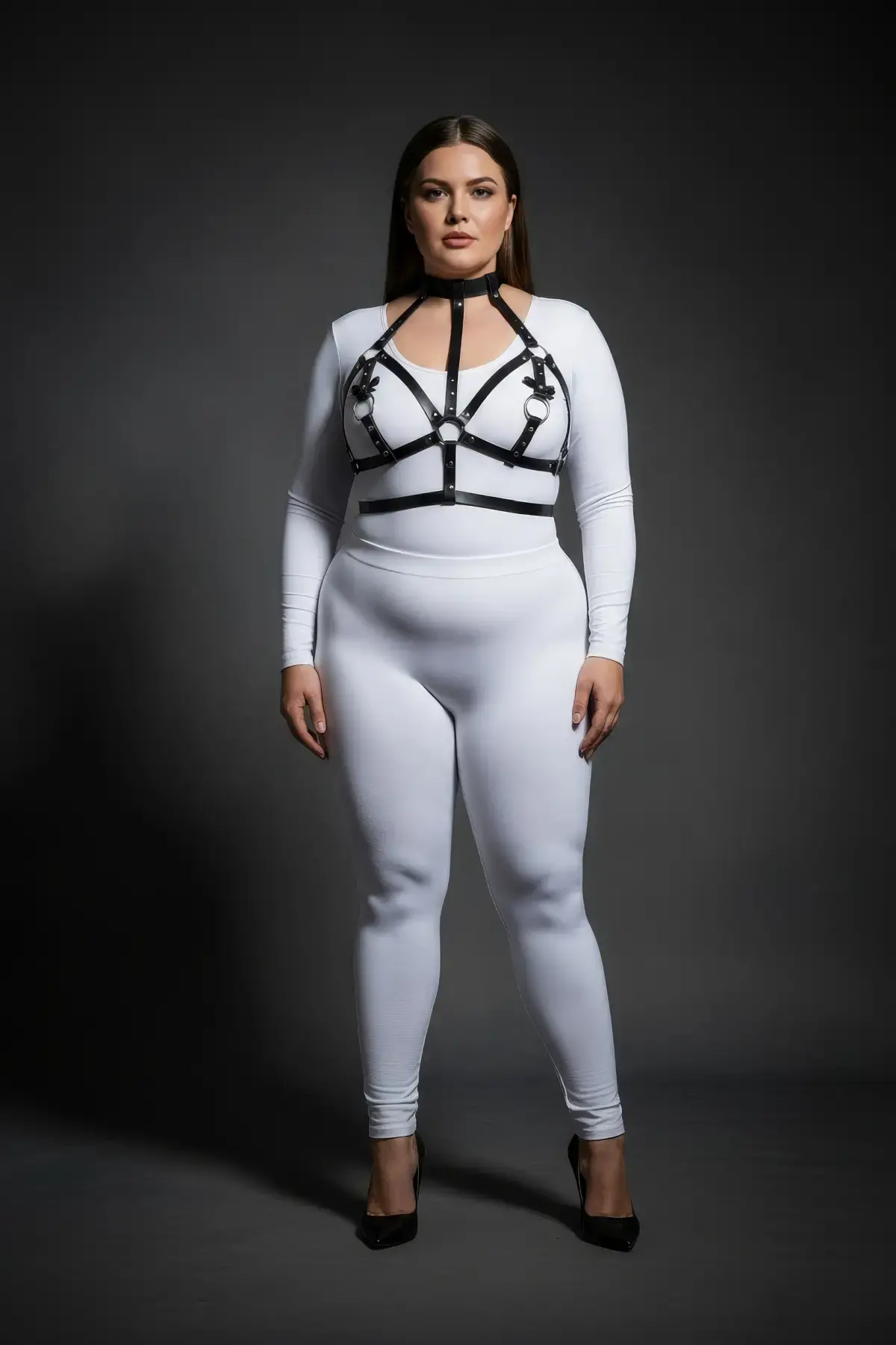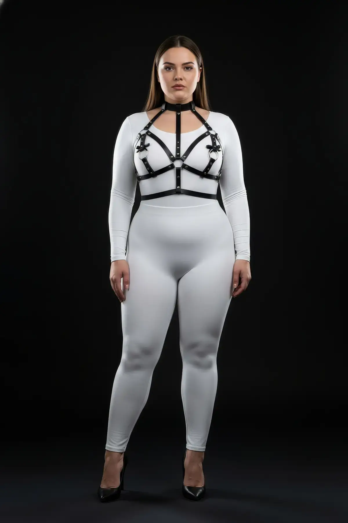 Büyük Beden Siyah Kadın Deri Harness Takım Boyunluk ve Halka Detaylı Fantazi Aksesuar - APFT473