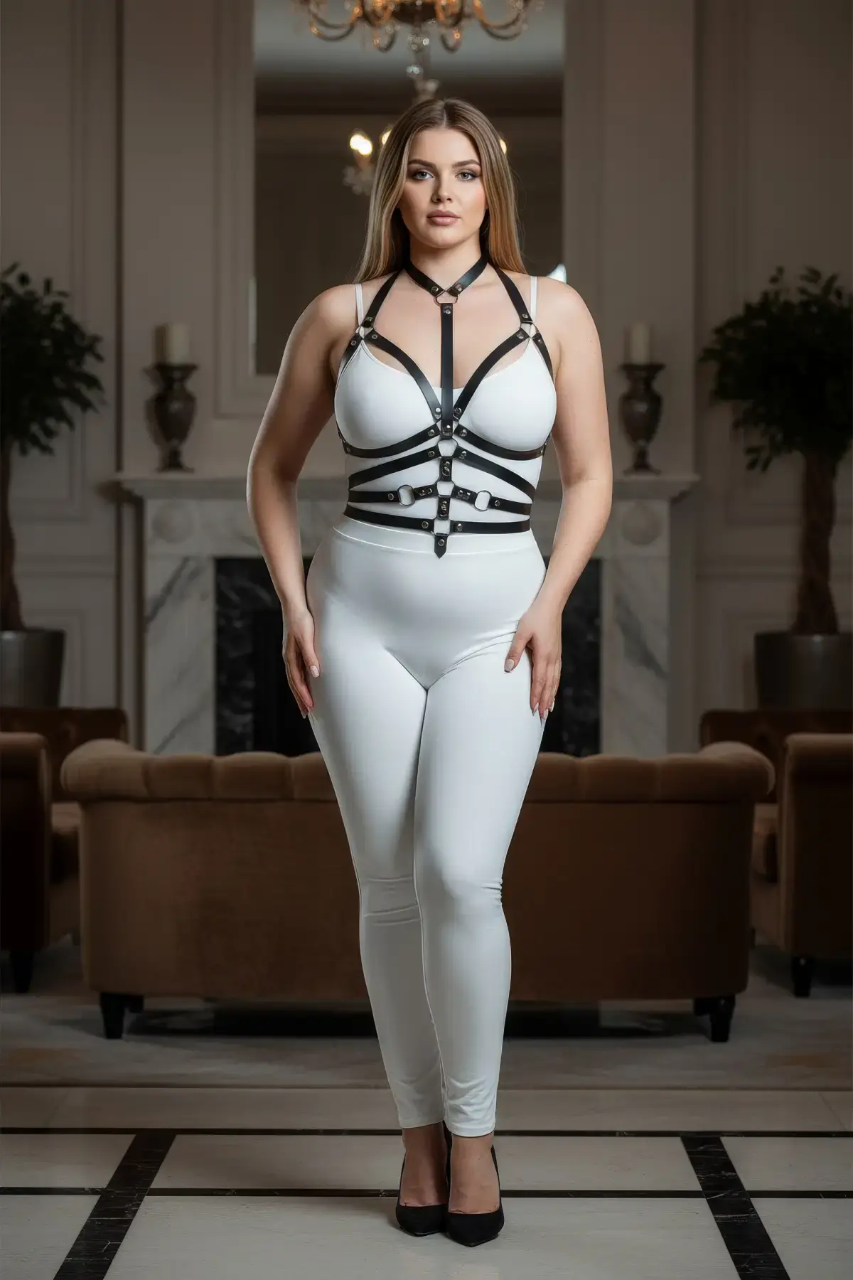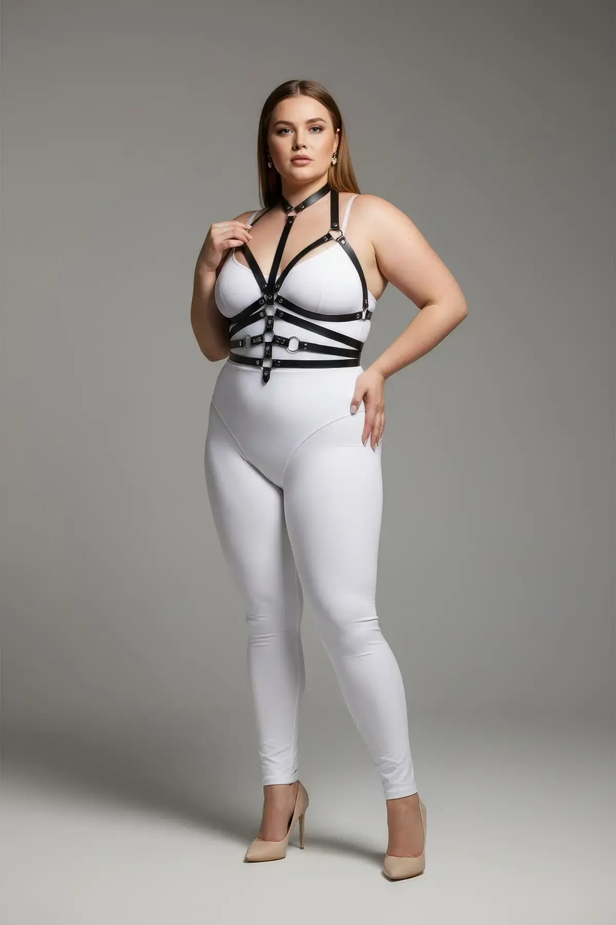 Büyük Beden Siyah Kadın Deri Harness Takım Yüksek Yaka Kombin Aksesuarı - APFT1286