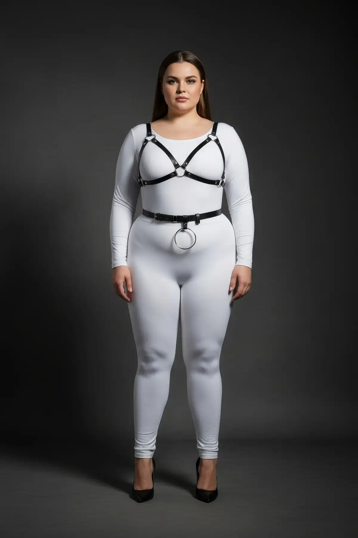 Büyük Beden Siyah Kadın Deri Harness Takım Halka Detaylı Fantezi Vücut Aksesuarı - APFT651