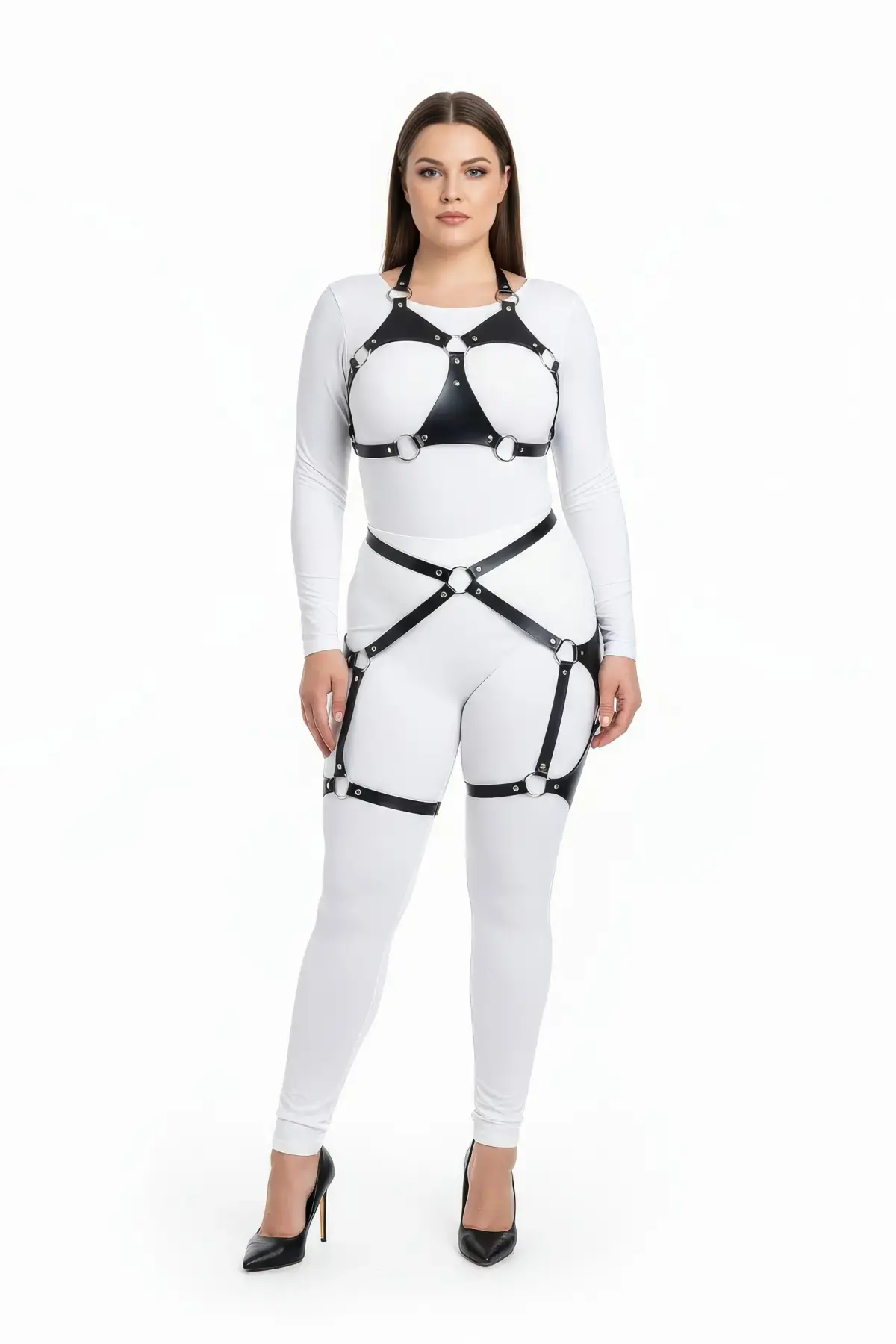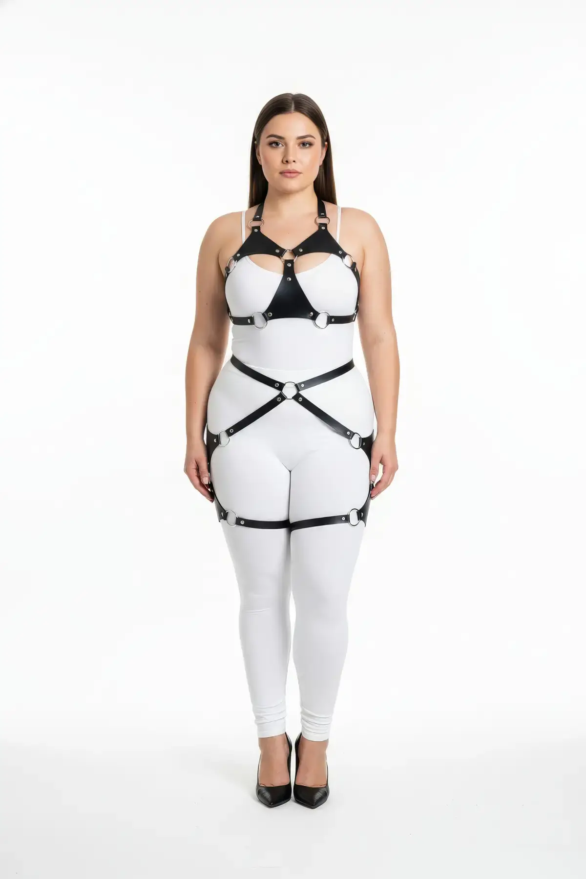 Büyük Beden Siyah Kadın Deri Jartiyer Harness Bel ve Bacak Detaylı Şık Aksesuar - APFT598