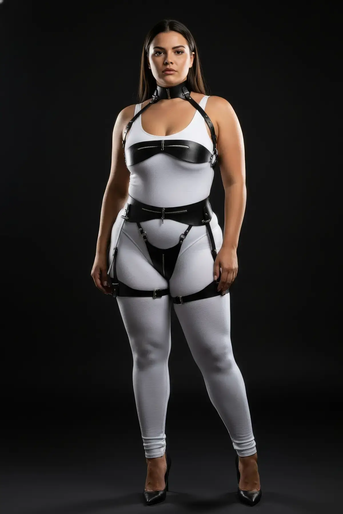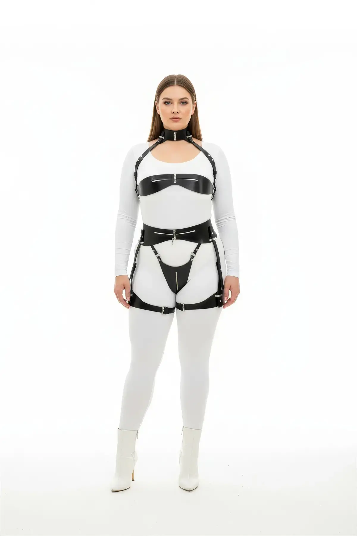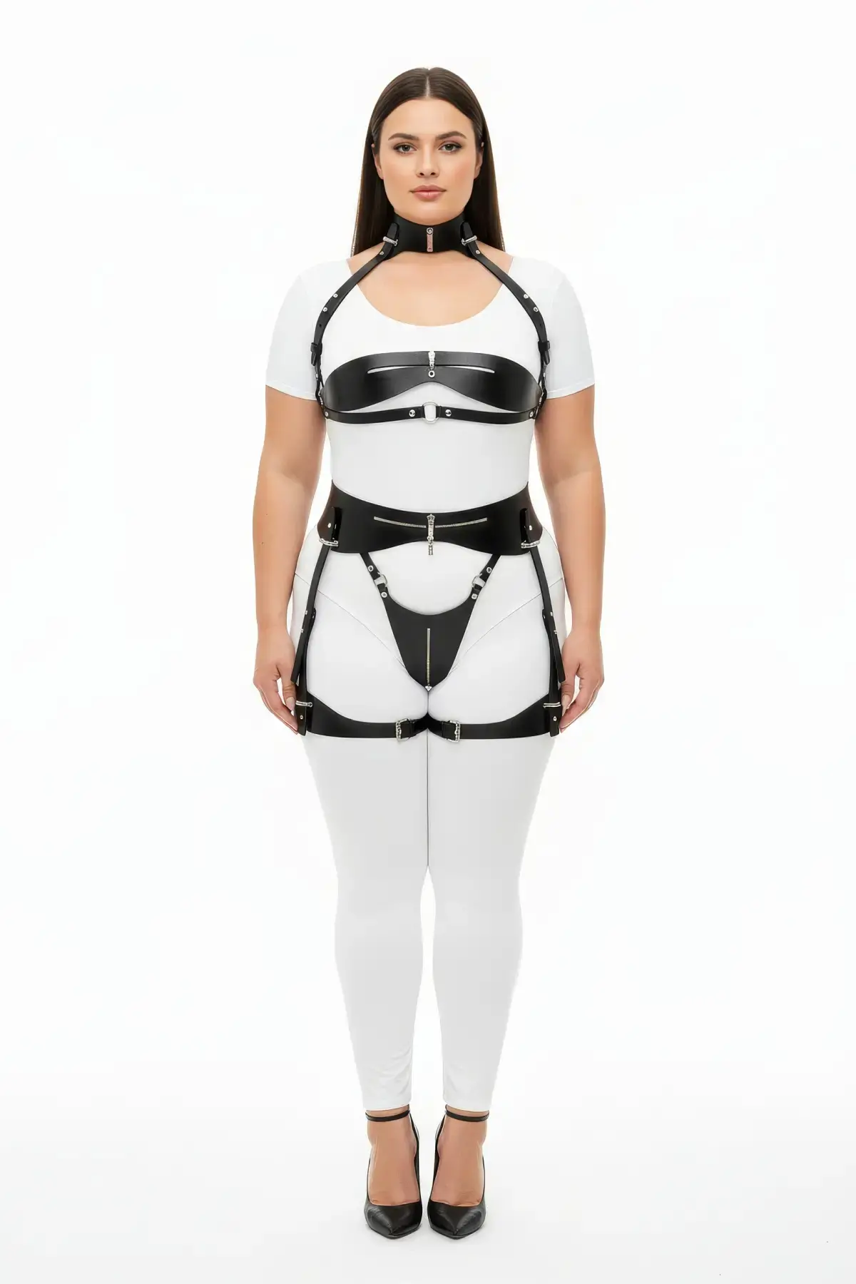 Büyük Beden Siyah Kadın Deri Harness Takım Jartiyerli Fantezi Vücut Aksesuarı - APFT1373