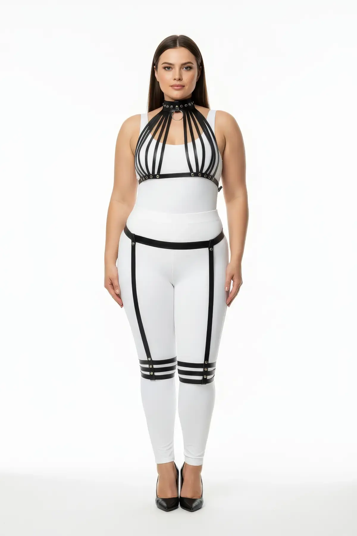 Büyük Beden Siyah Kadın Full Body Deri Harness Takım Jartiyer Detaylı Özel Tasarım - APFT1231