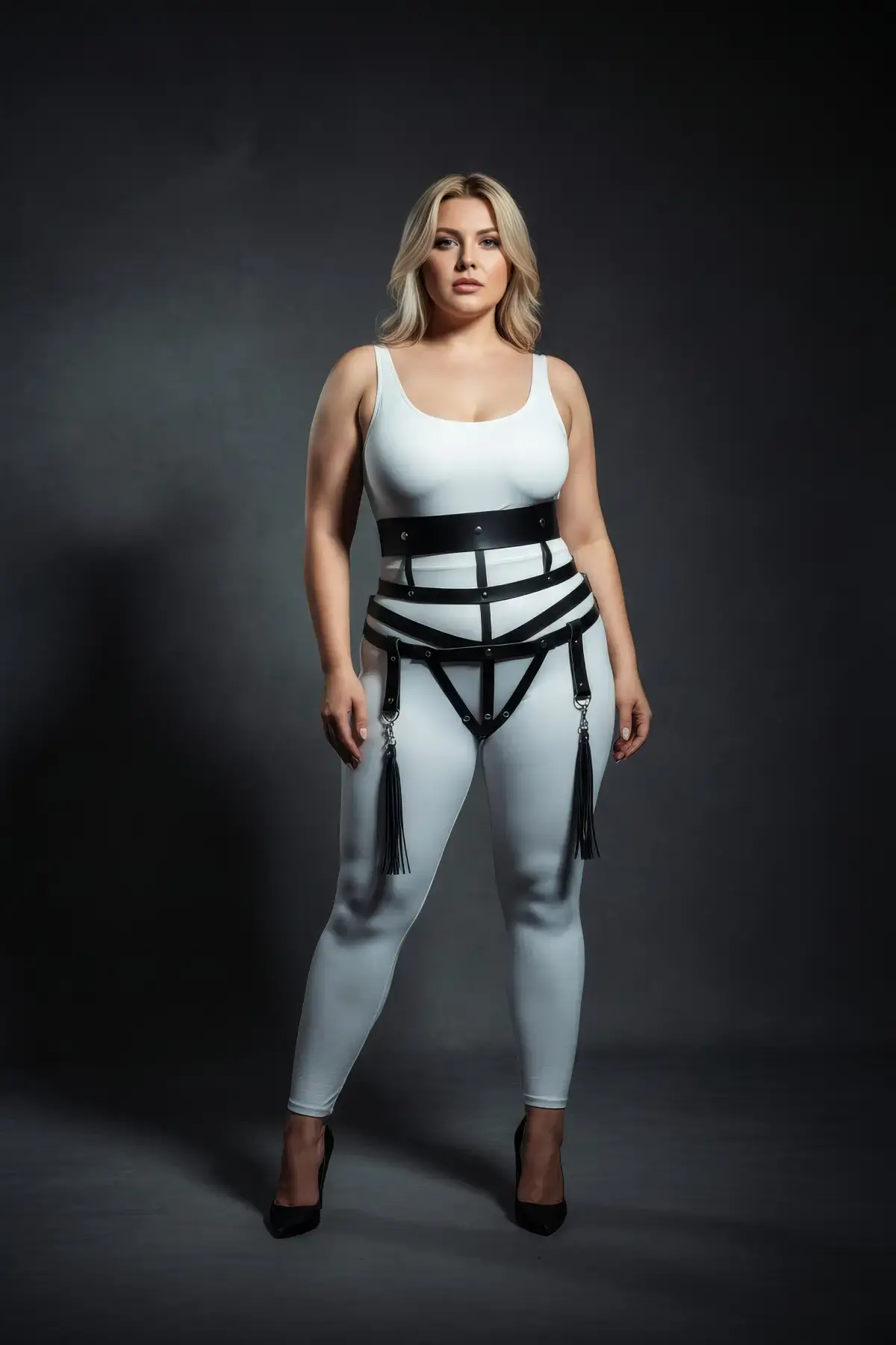 Büyük Beden Siyah Kadın Deri Harness Takım Jartiyerli Püskül Detaylı - APFT397