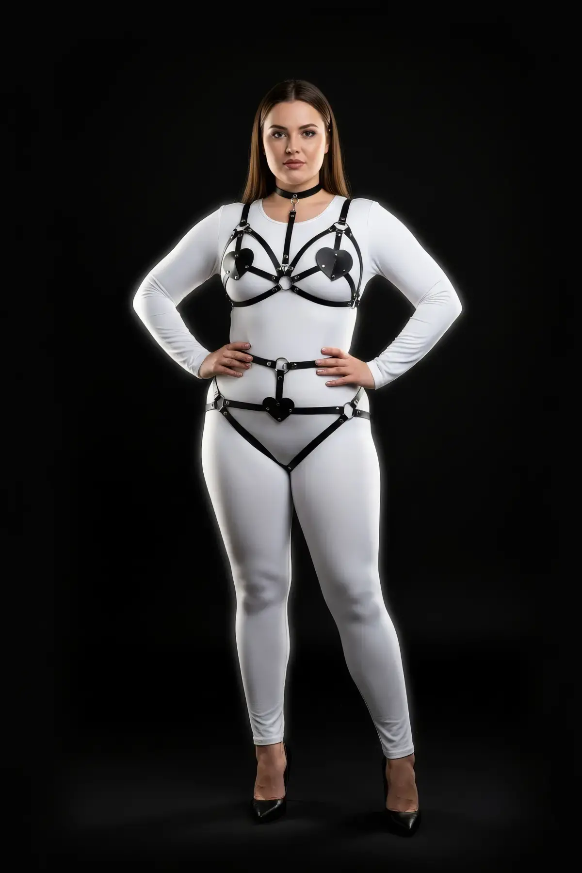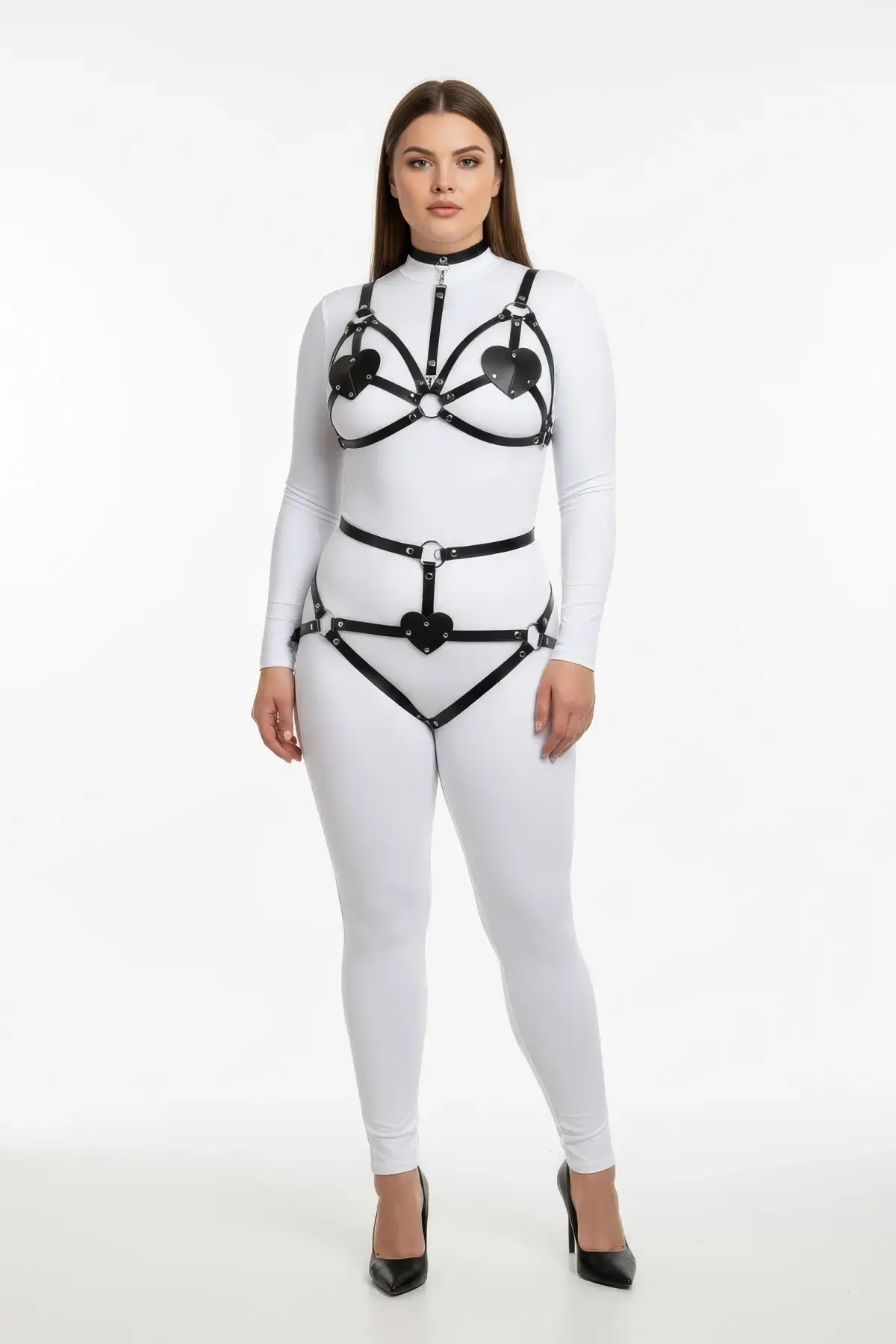 Büyük Beden Siyah Kadın Deri Harness Takım Kalp Detaylı Fantezi Aksesuar - APFT467