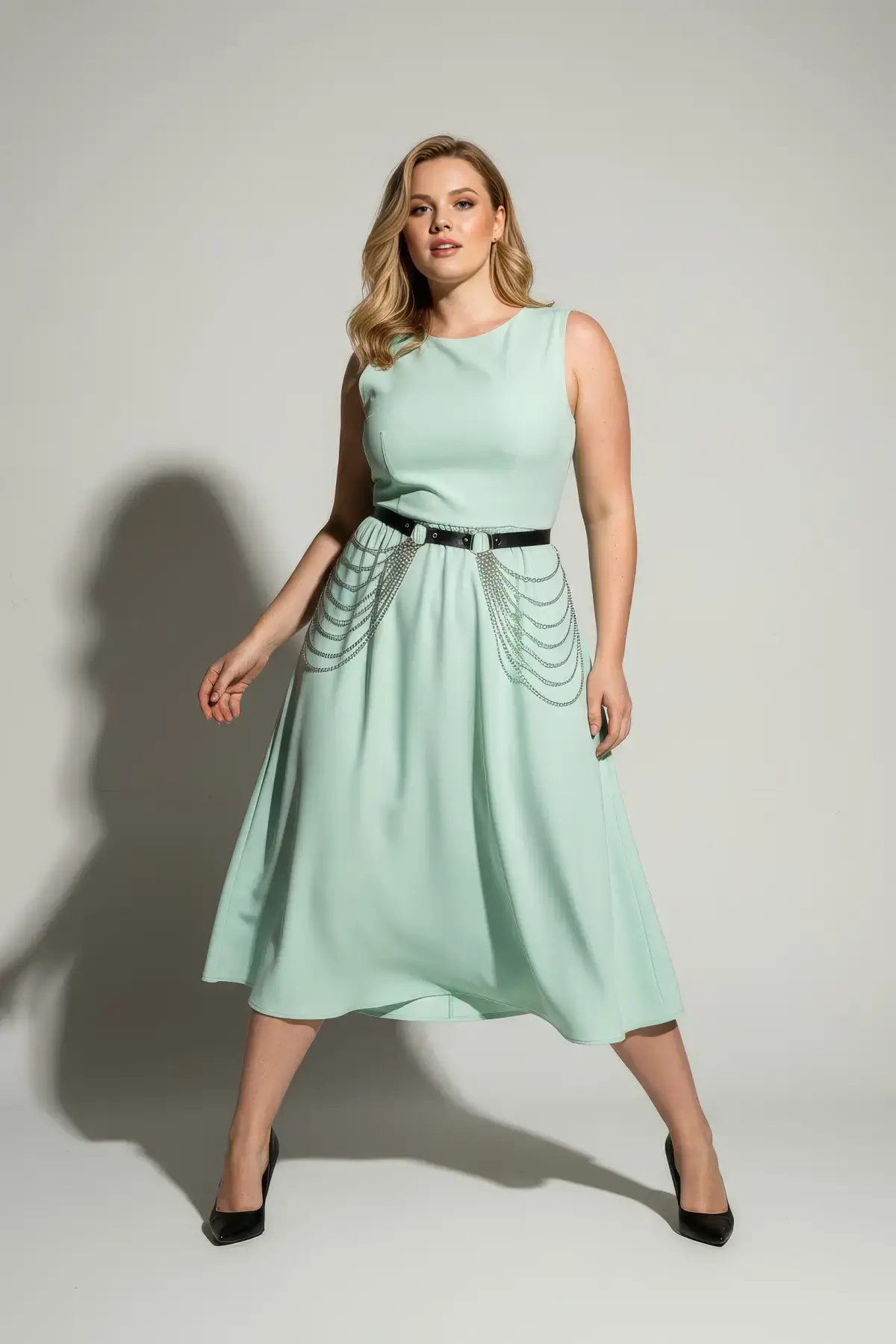Büyük Beden Yeşil Kadın Kemer Çok Katmanlı Zincir Detaylı - APFT729