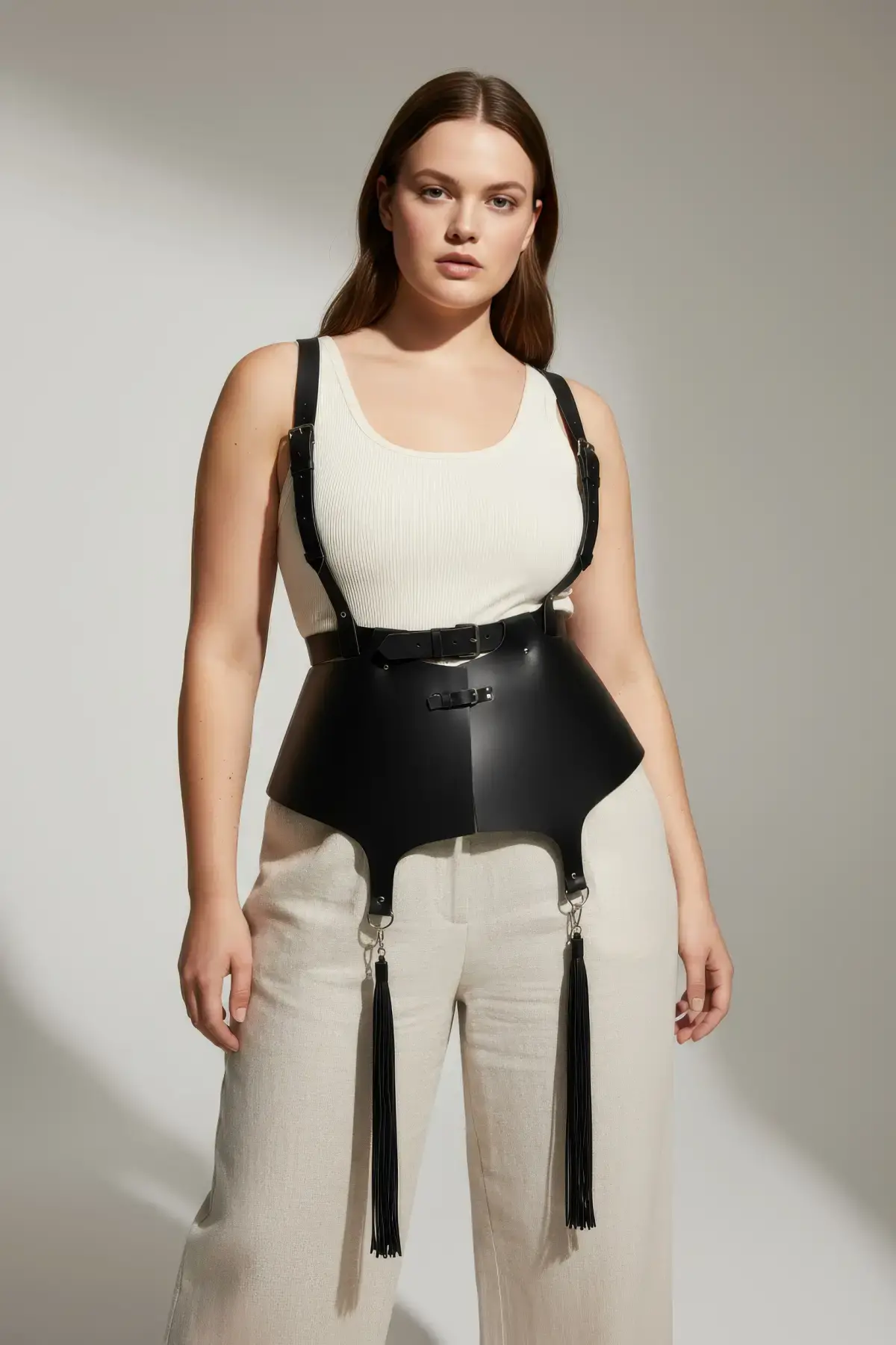 Büyük Beden Siyah Kadın Deri Korse Kemer, Omuz Askılı ve Püskül Detaylı - APFT787