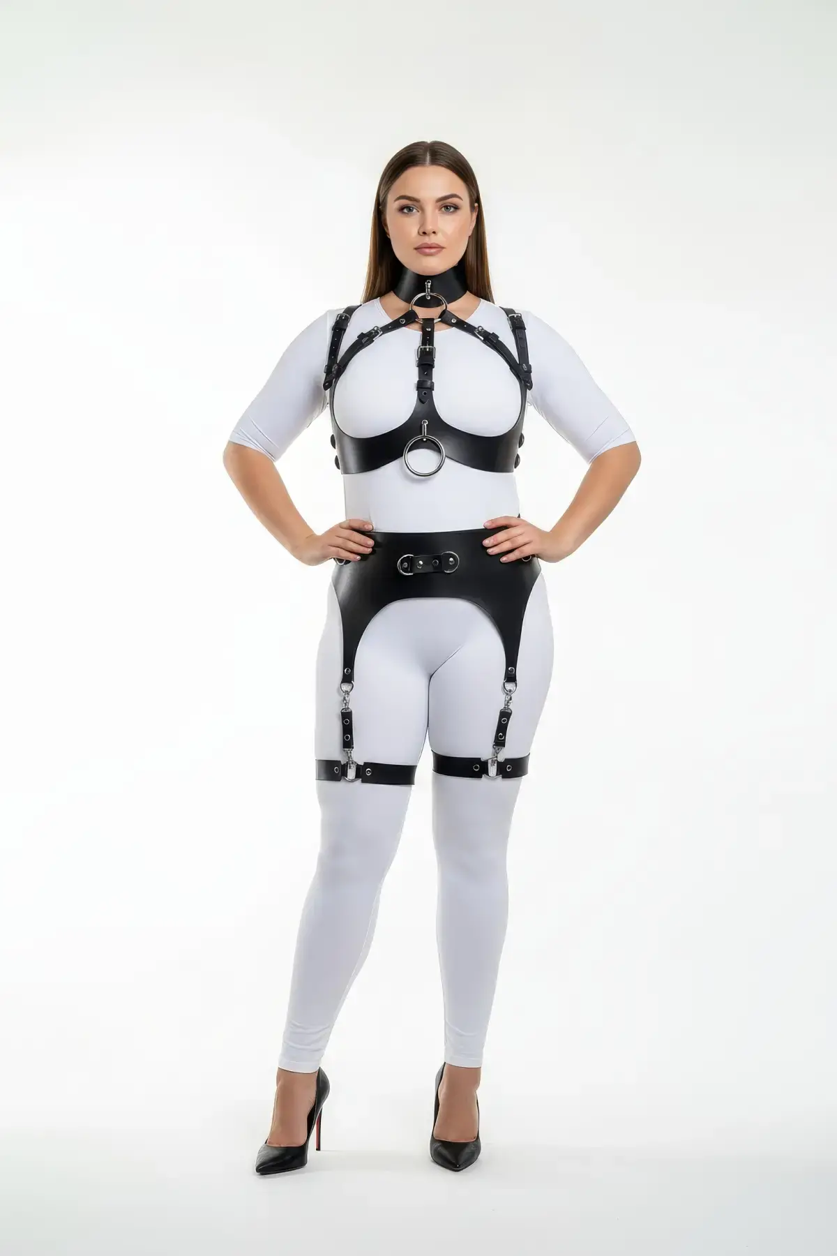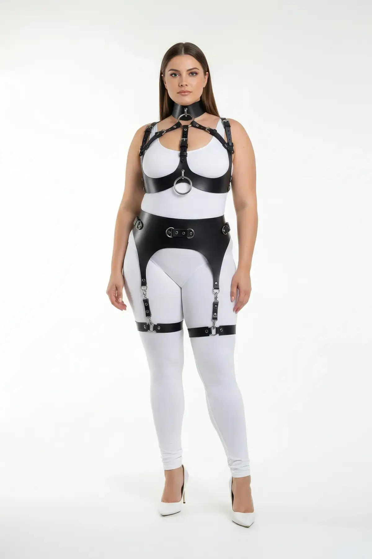 Büyük Beden Siyah Kadın Full Body Deri Harness Takım Jartiyer Detaylı Özel Tasarım - APFT1231