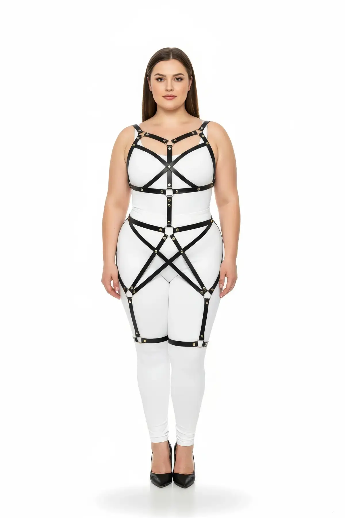 Büyük Beden Siyah Kadın Full Body Deri Harness Takım Jartiyer Detaylı Özel Tasarım - APFT1231