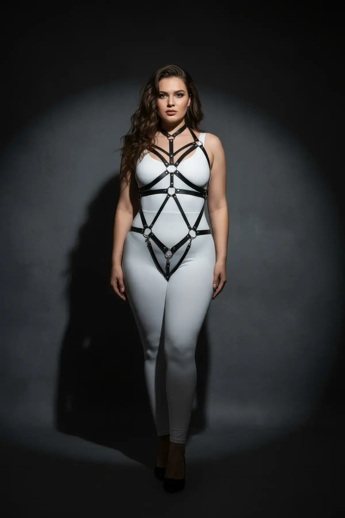 Büyük Beden Siyah Kadın Harness Takım Full Body Halka Detaylı Deri Aksesuarı - APFT316