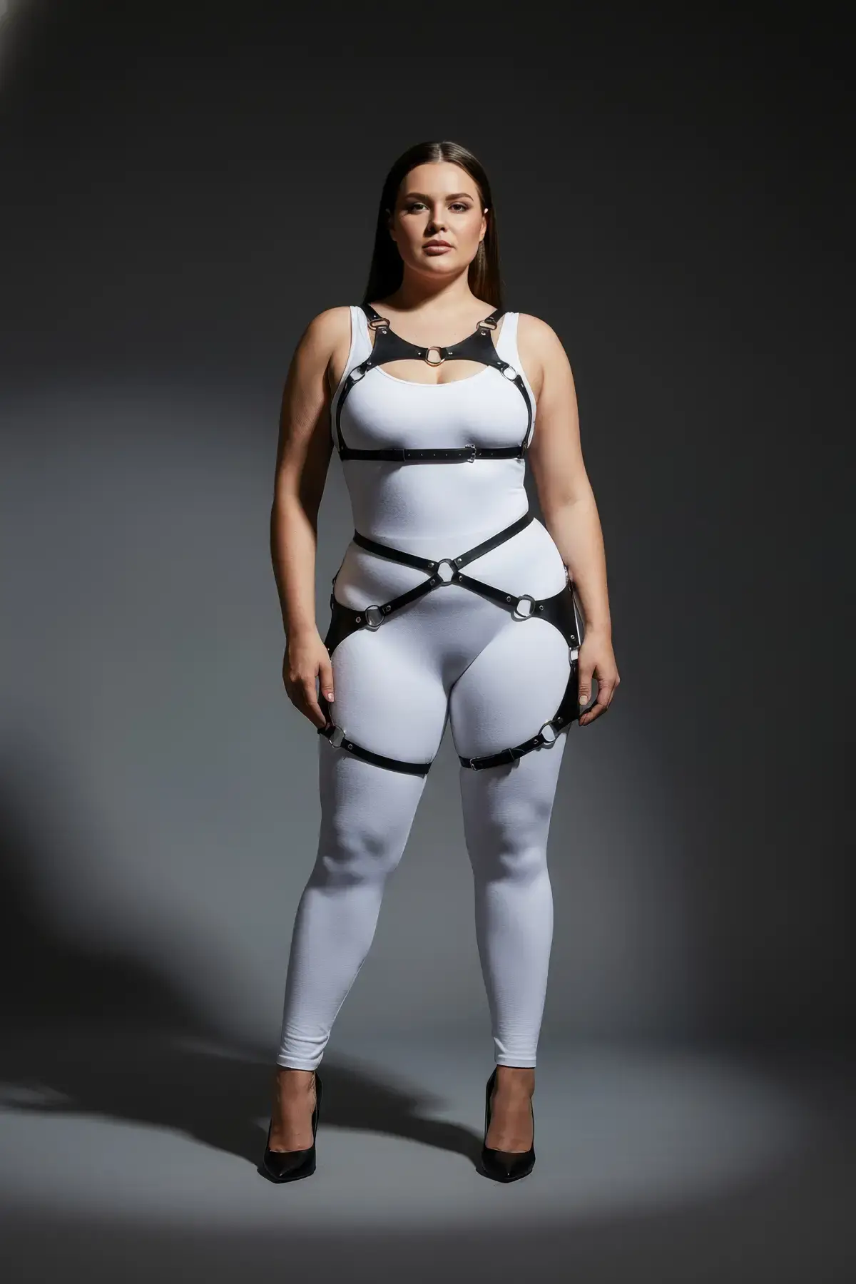 Büyük Beden Siyah Kadın Deri Harness Takım Jartiyerli Fantezi Vücut Aksesuarı - APFT1373