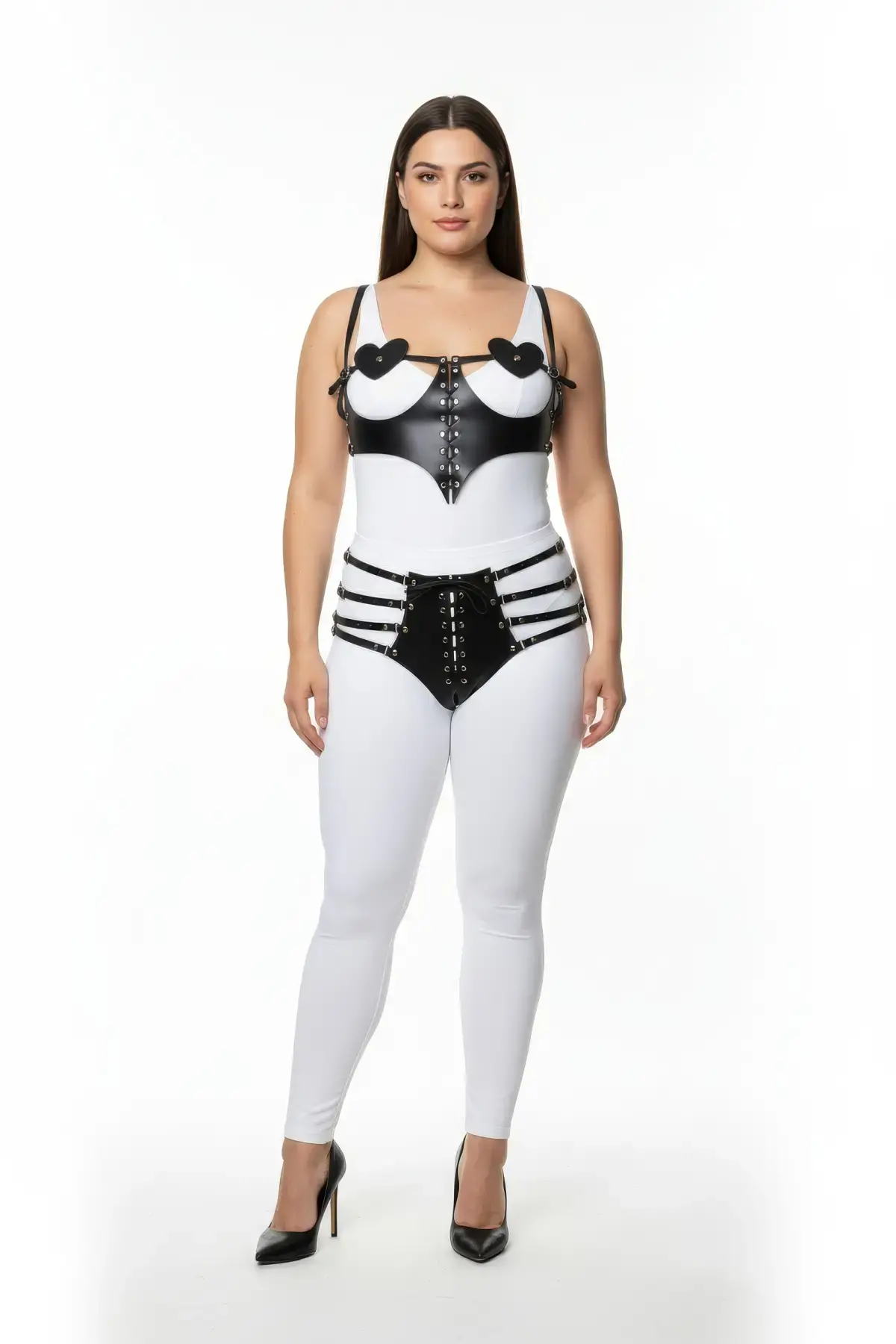 Büyük Beden Siyah Kadın Harness Takım Kalp Detaylı Bağcıklı Fantazi Deri Set - APFT1256