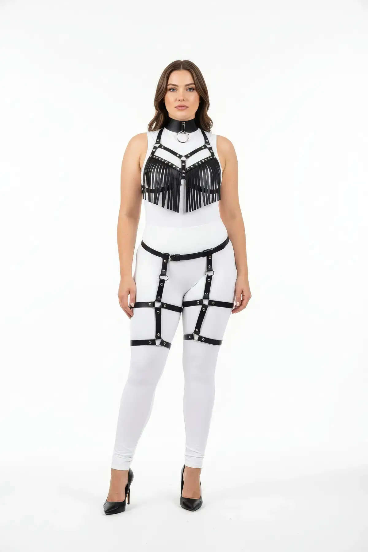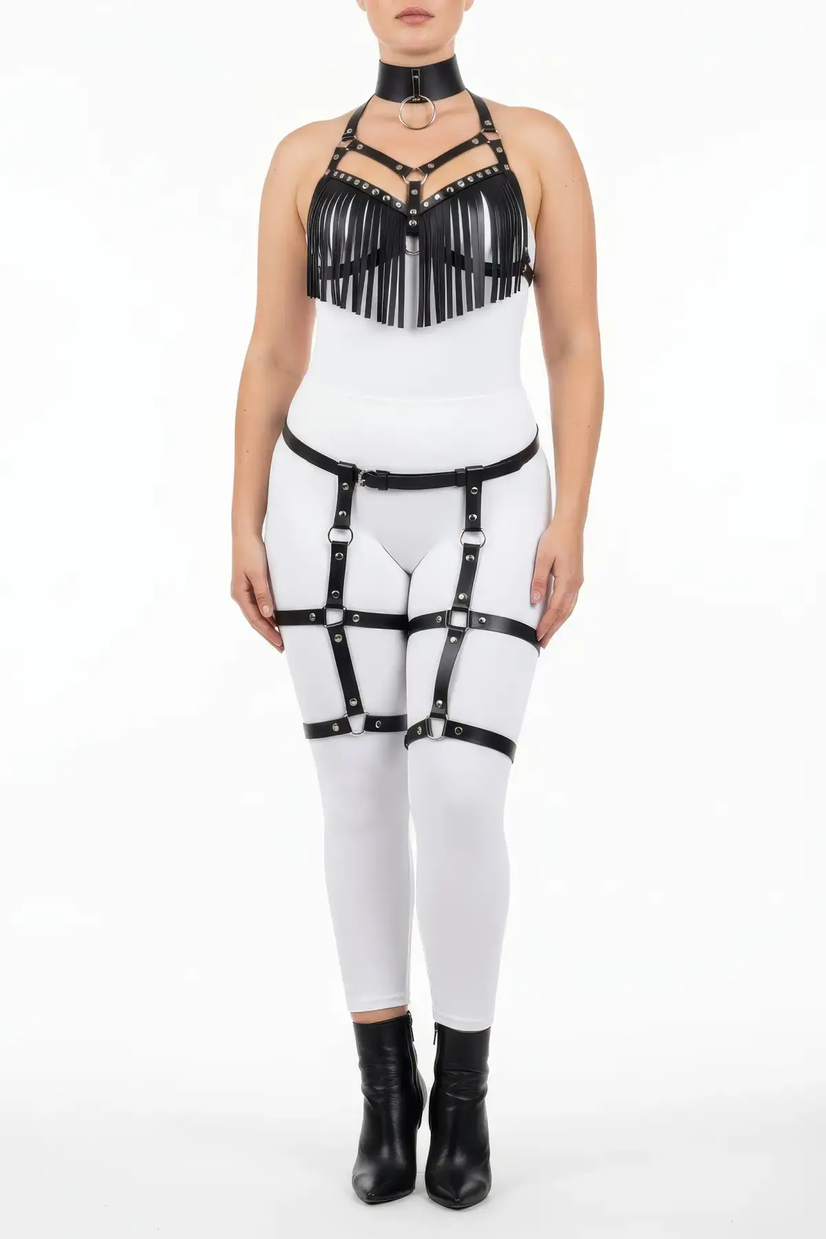 Büyük Beden Siyah Kadın Harness Takım Püsküllü Deri Görünümlü Jartiyerli Fantezi Aksesuar - APFT715