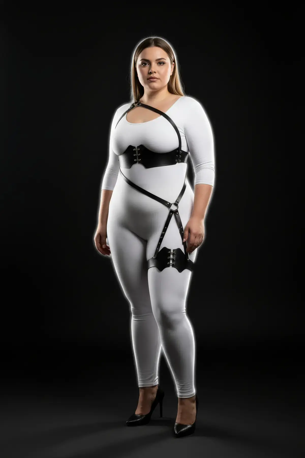 Büyük Beden Siyah Kadın Kemer Harness Stili Korse Görünümlü Deri Vücut Aksesuarı - APFT199