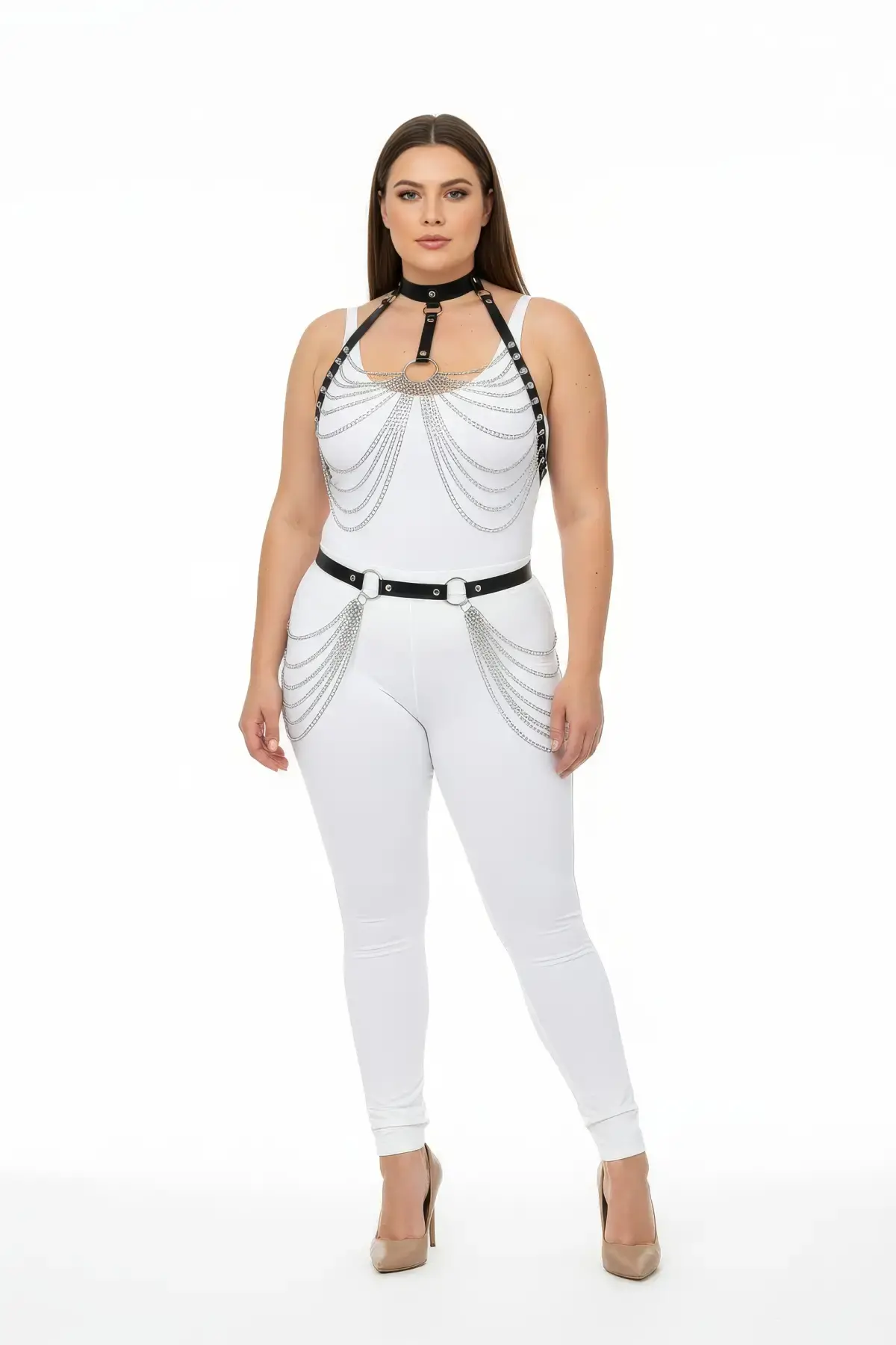 Büyük Beden Siyah Kadın Harness Takım Zincir Detaylı Deri Fantezi Aksesuarı - APFT701