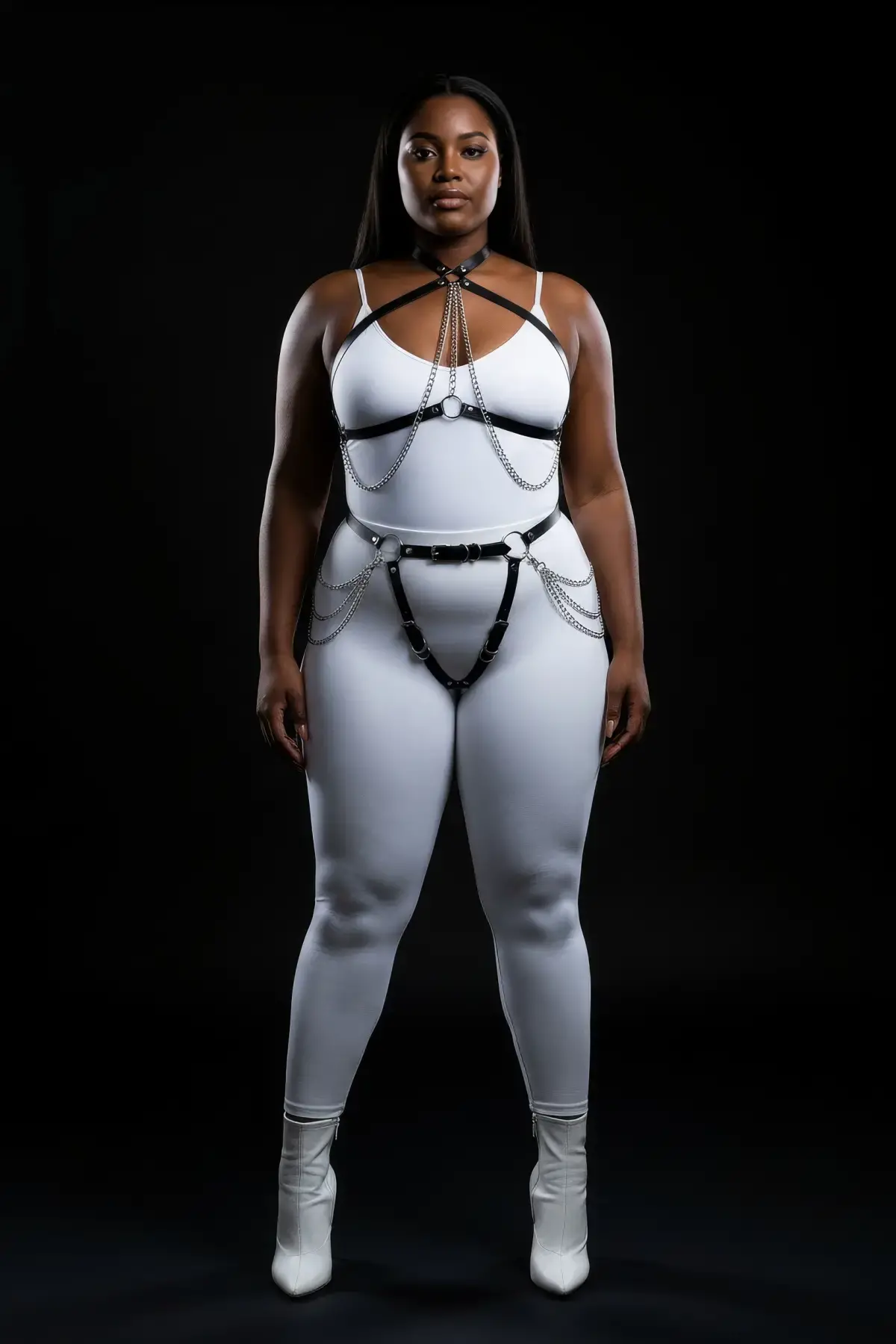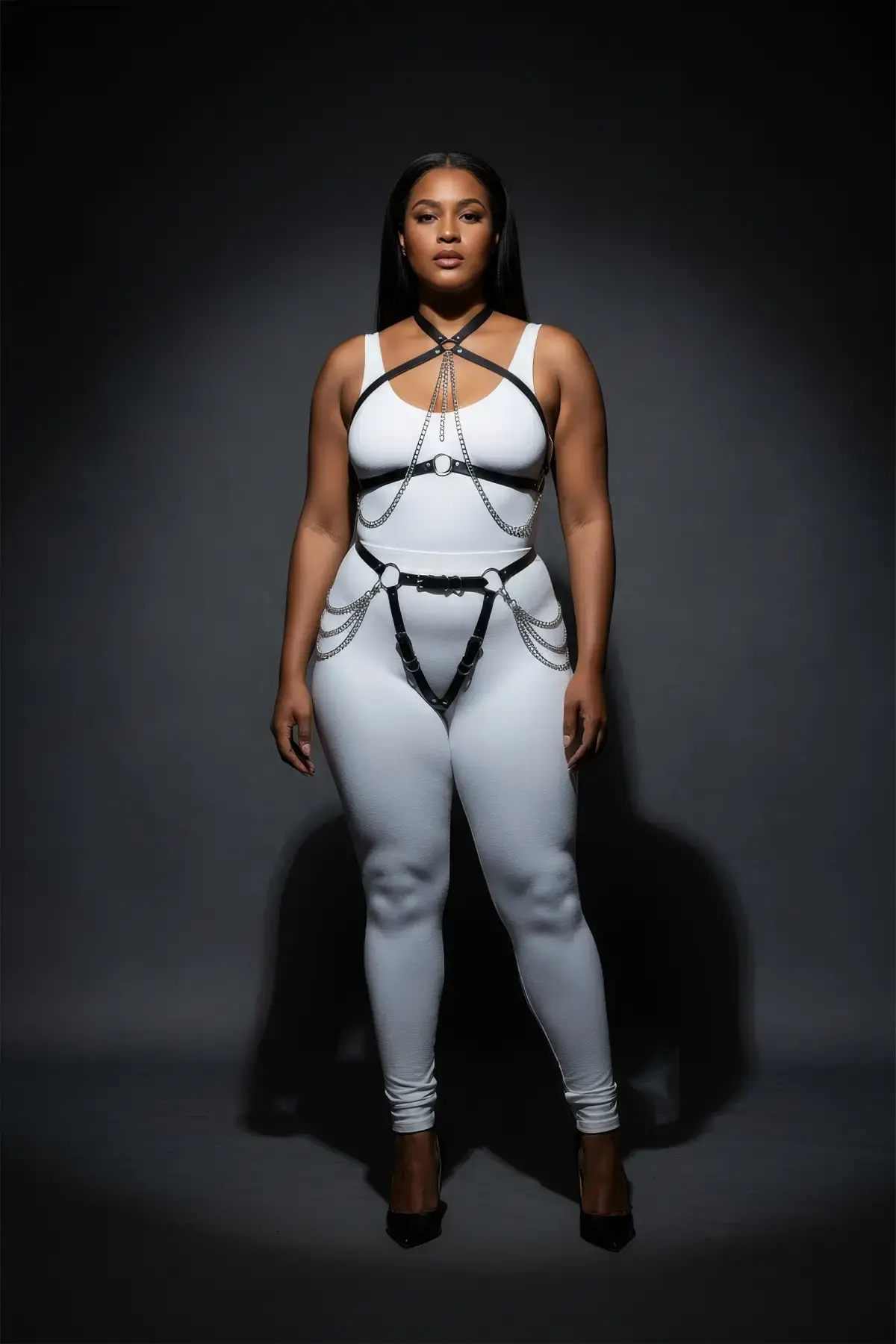 Büyük Beden Siyah Kadın Harness Takım Zincir Detaylı Deri Vücut Aksesuarı - APFT1084
