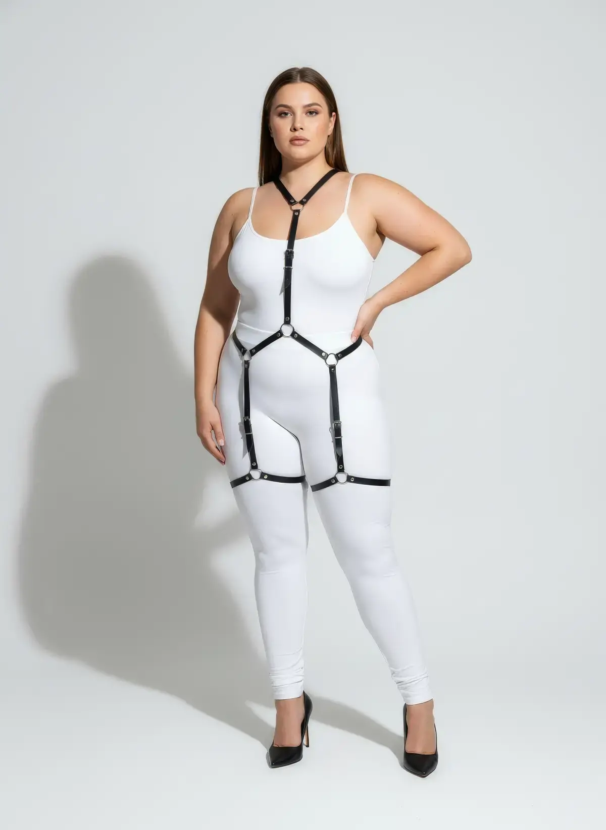 Büyük Beden Siyah Kadın Full Body Deri Harness Takım Halka Detaylı Fantazi Aksesuar - APFT759