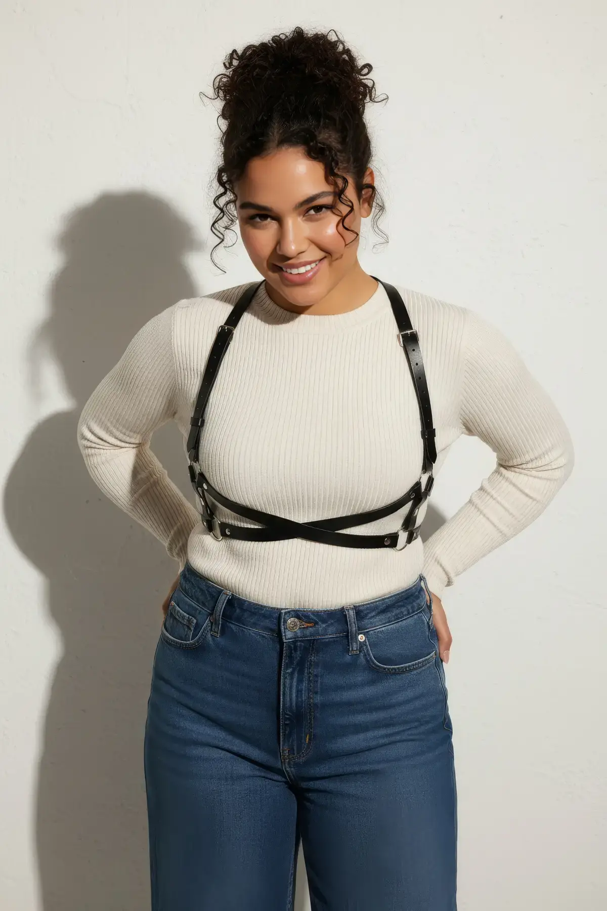 Büyük Beden Siyah Kadın Kemer Deri Harness Vücut Aksesuarı Çapraz Detaylı - APFT204