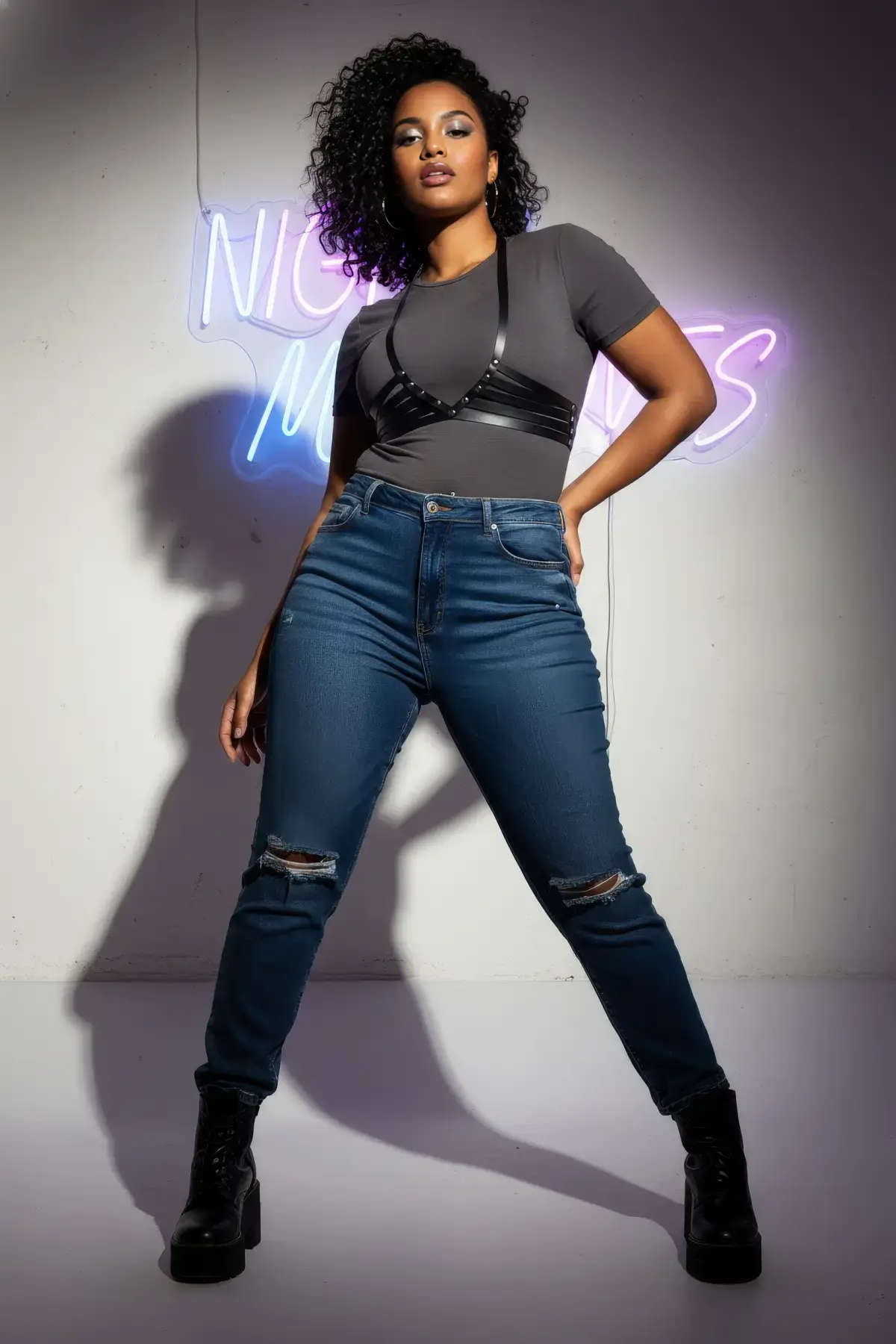 Büyük Beden Siyah Kadın Kemer Harness Stili Korse Görünümlü Deri Vücut Aksesuarı - APFT199