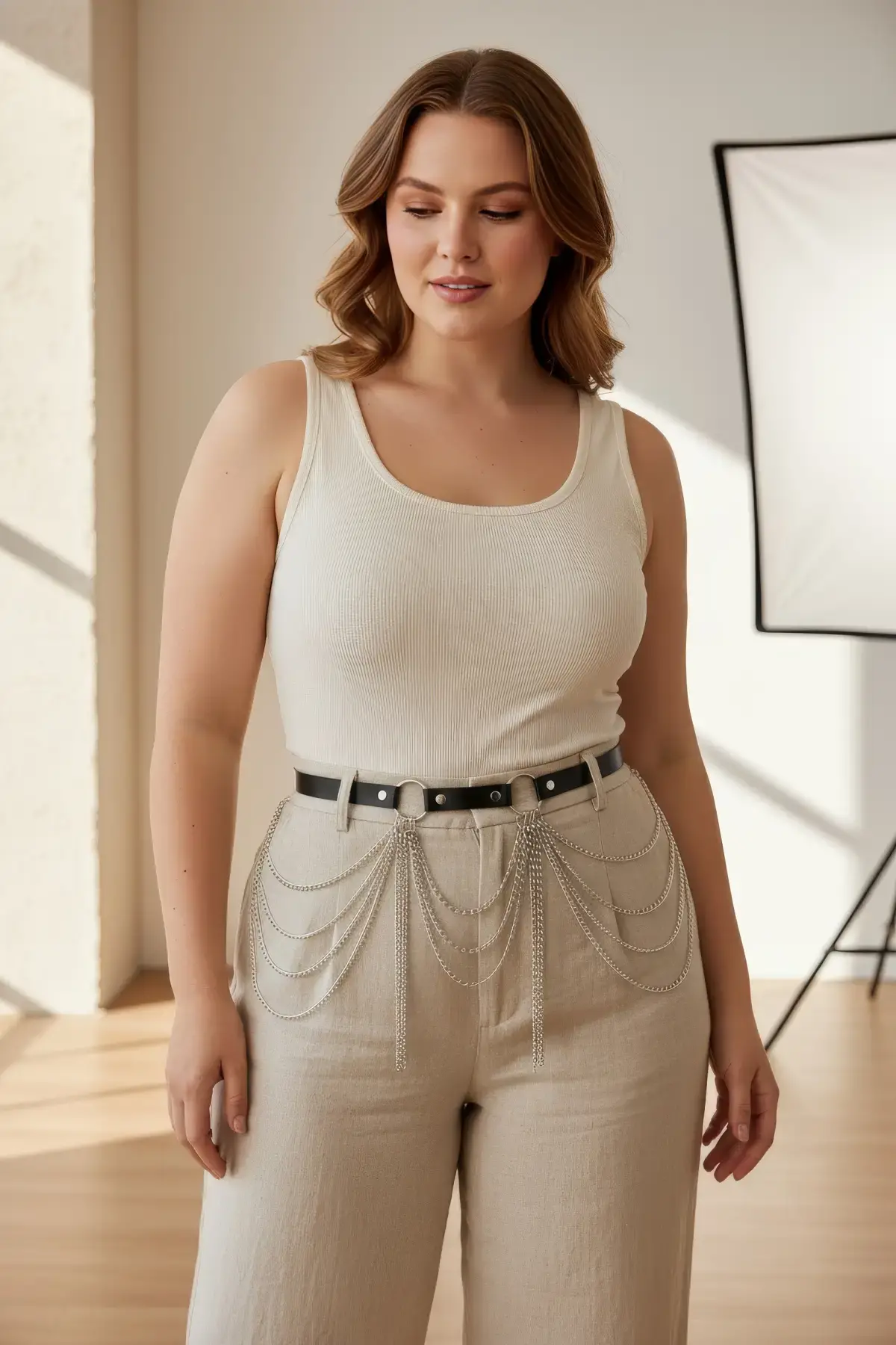 Büyük Beden Siyah Kadın Kemer Katmanlı Zincir Detaylı Kombin Tamamlayıcı - APFT729