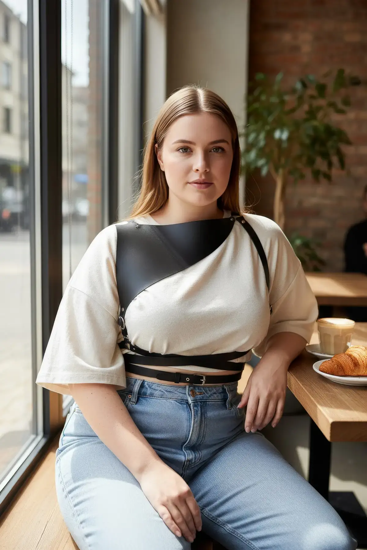 Büyük Beden Taba Kadın Deri Kemer, Korse ve Püskül Detaylı Harness - APFT985